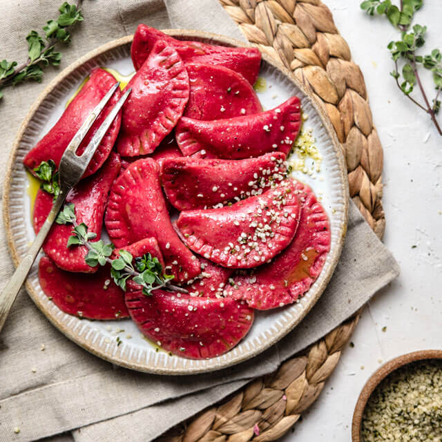 I have a couple of flavors of vegan ravioli in my fridge for my vegan pasta taste test, but I haven’t made a good excuse to waste a few hours tasting a lot of pasta yet. If you would rather have homemade ravioli, try Almond Cow’s beet ravioli today.