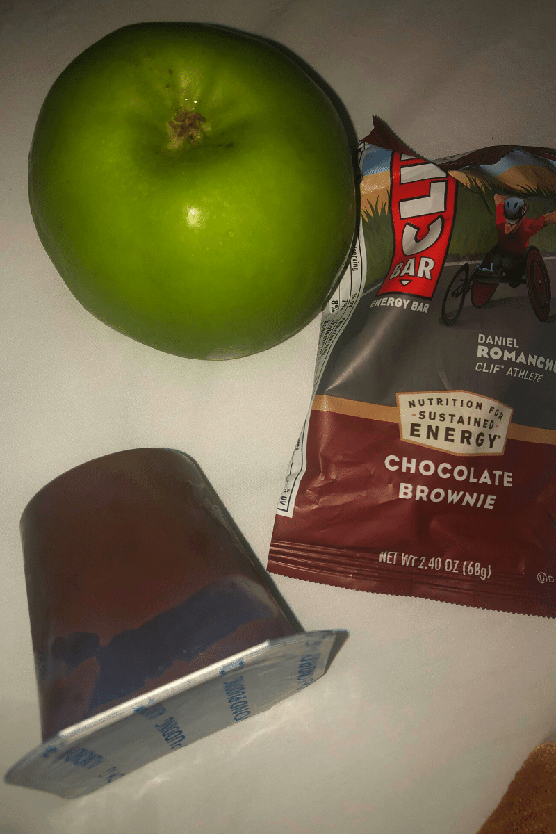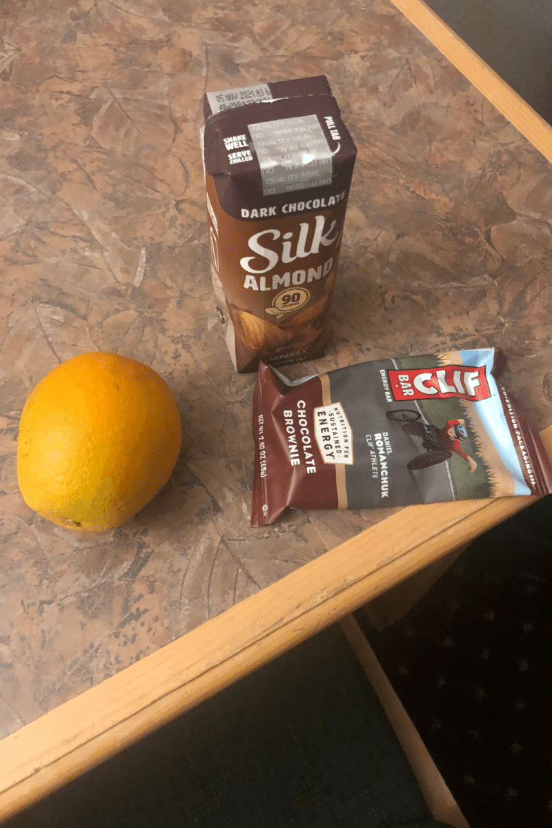 Before leaving the hotel, I had a chocolate brownie Clif bar, a Granny Smith apple, and some chocolate almond pudding.
