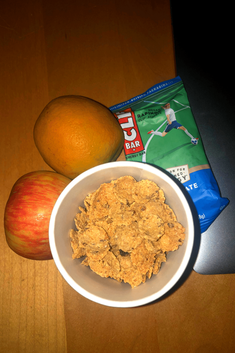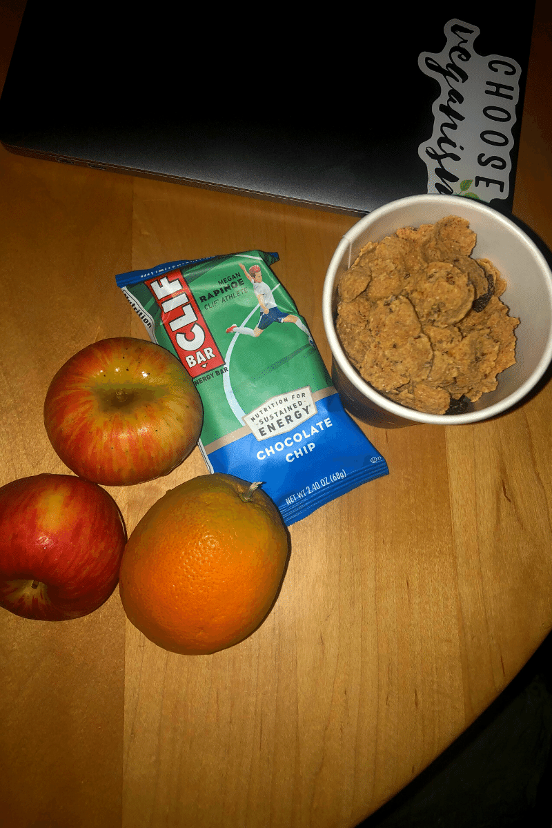 For breakfast, I had some vegan cereal, a chocolate chip Clif bar, Honeycrisp apples, and a blood orange.