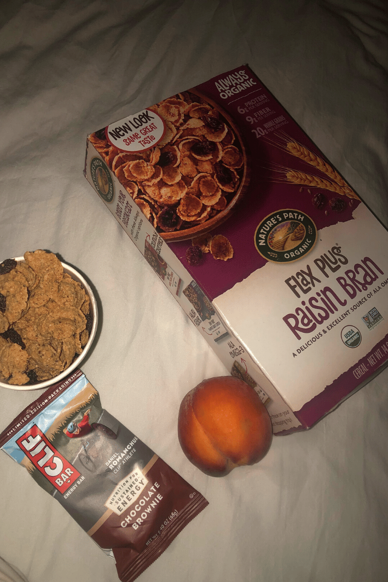 I originally put some Clif bars, Silk chocolate soy and chocolate almond milk, Safe + Fair granola, Arrowhead Mills puffed rice, and some vegan microwavable popcorn in my checked bag for future reference. After realizing my checked bag was over sixty pounds, I downsized to only bringing four Clif bars.