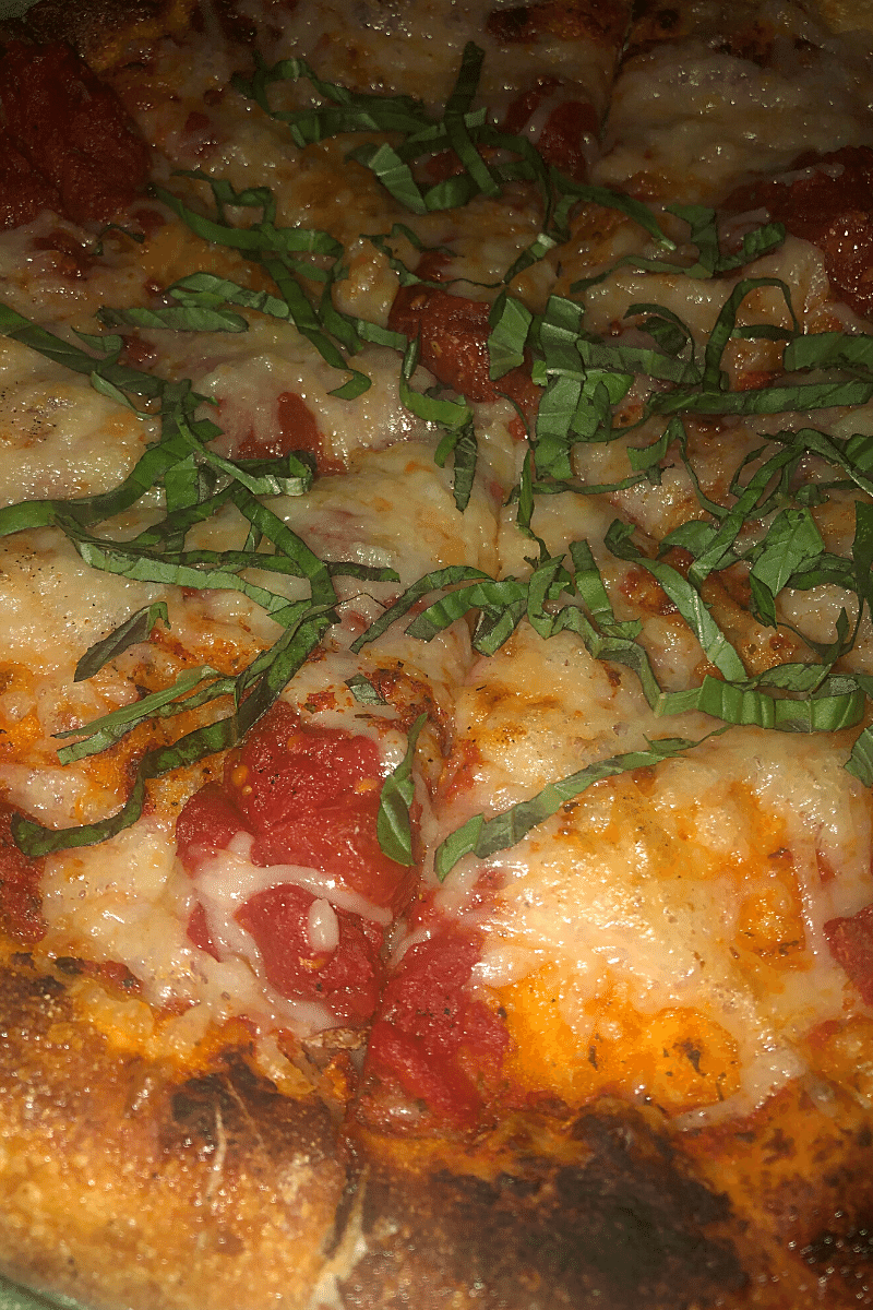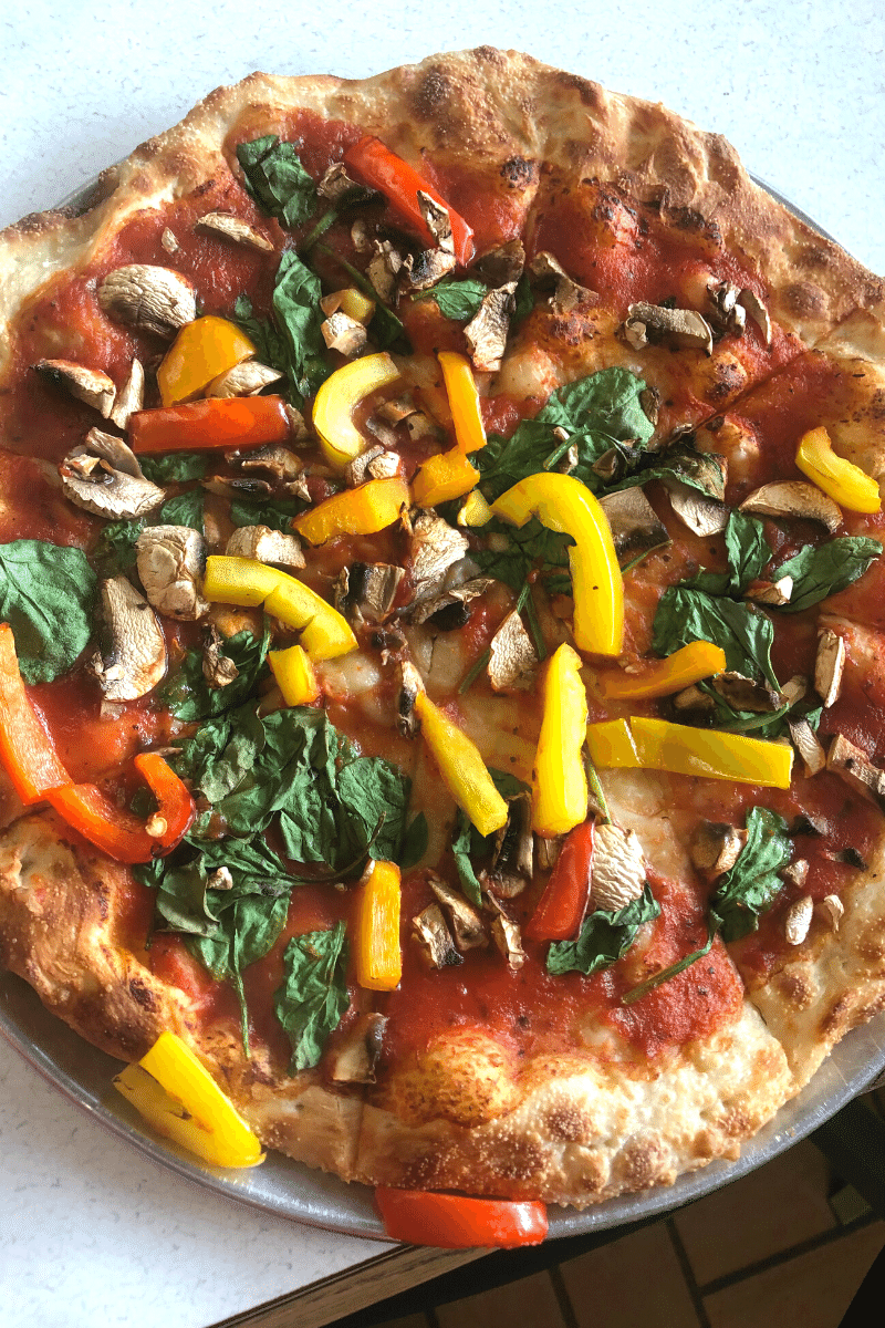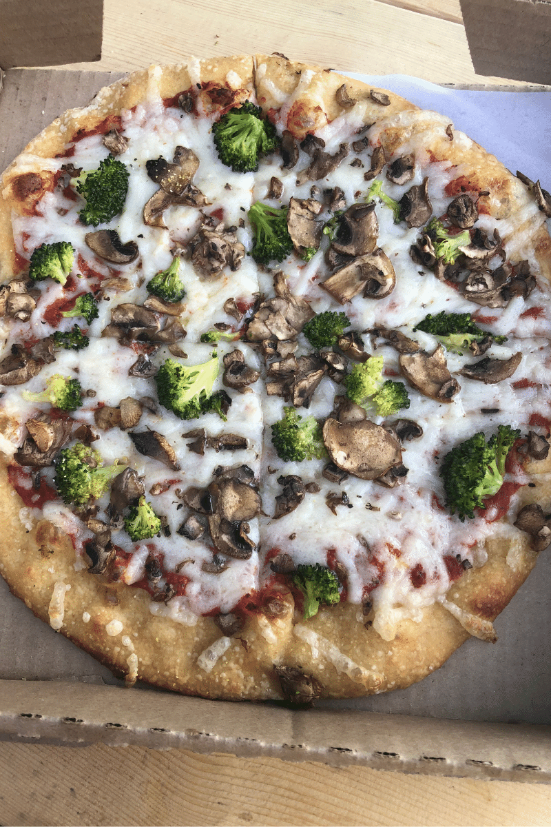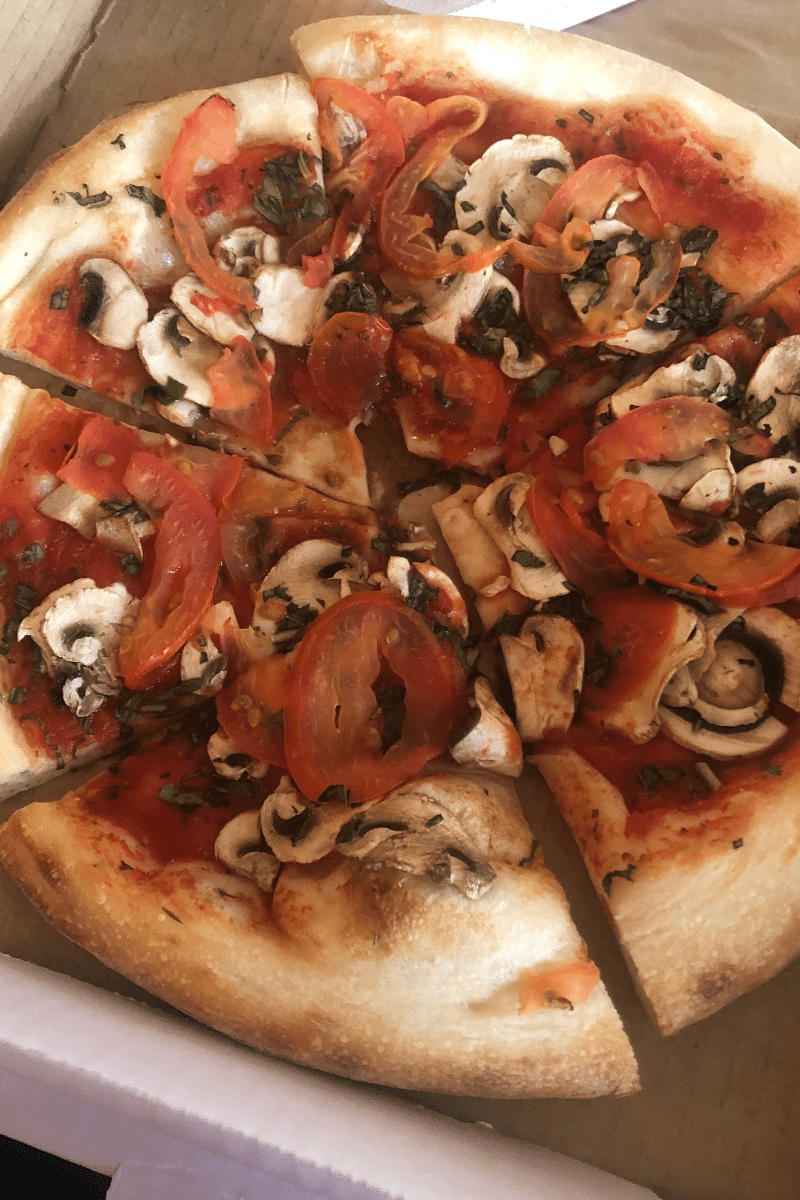 I had a custom 11″ pizza with no cheese, regular marinara, spinach, mushrooms, and bell peppers. Next time, I shouldn’t have put bell peppers on my personal pizza because I don’t like bell peppers as much as I used to.