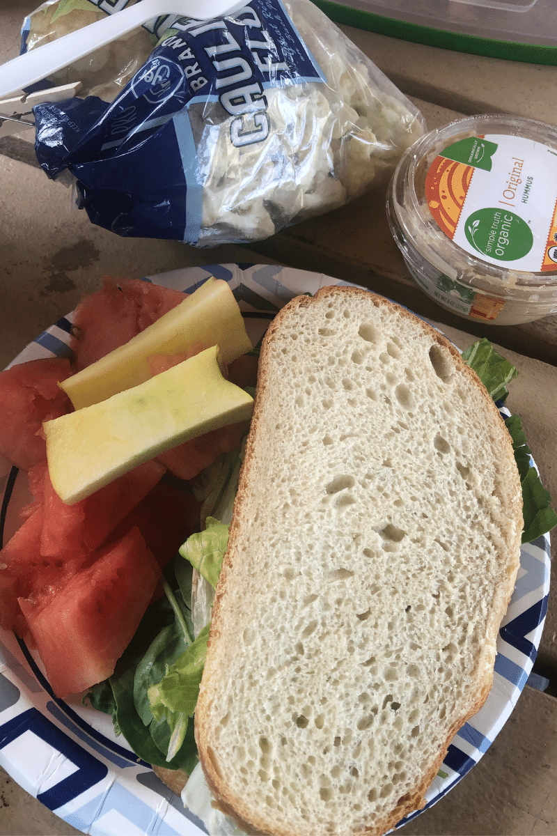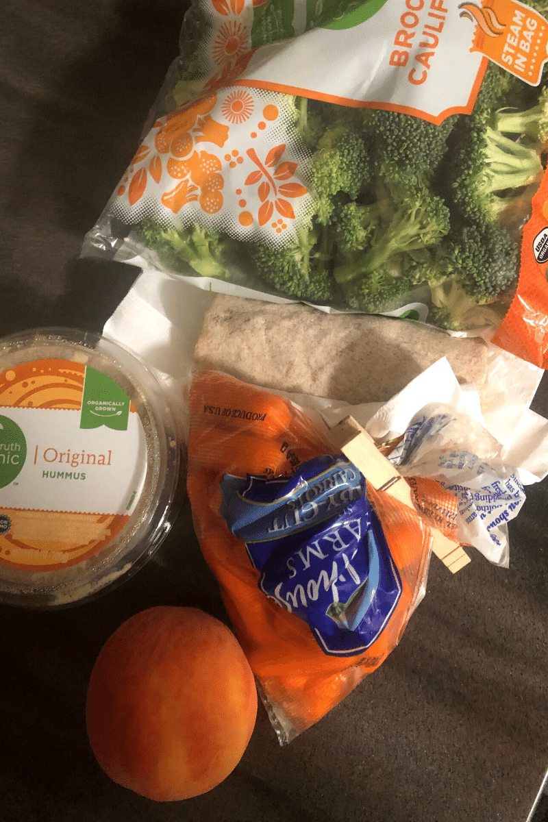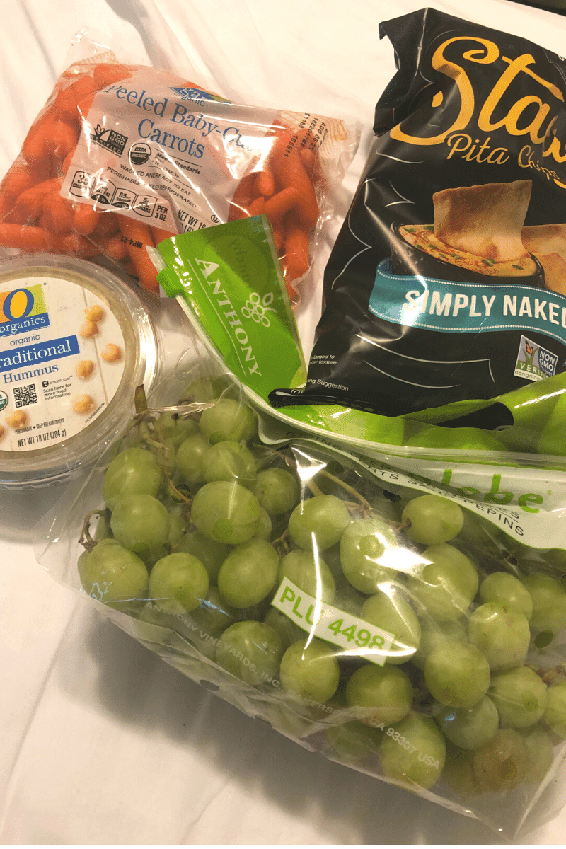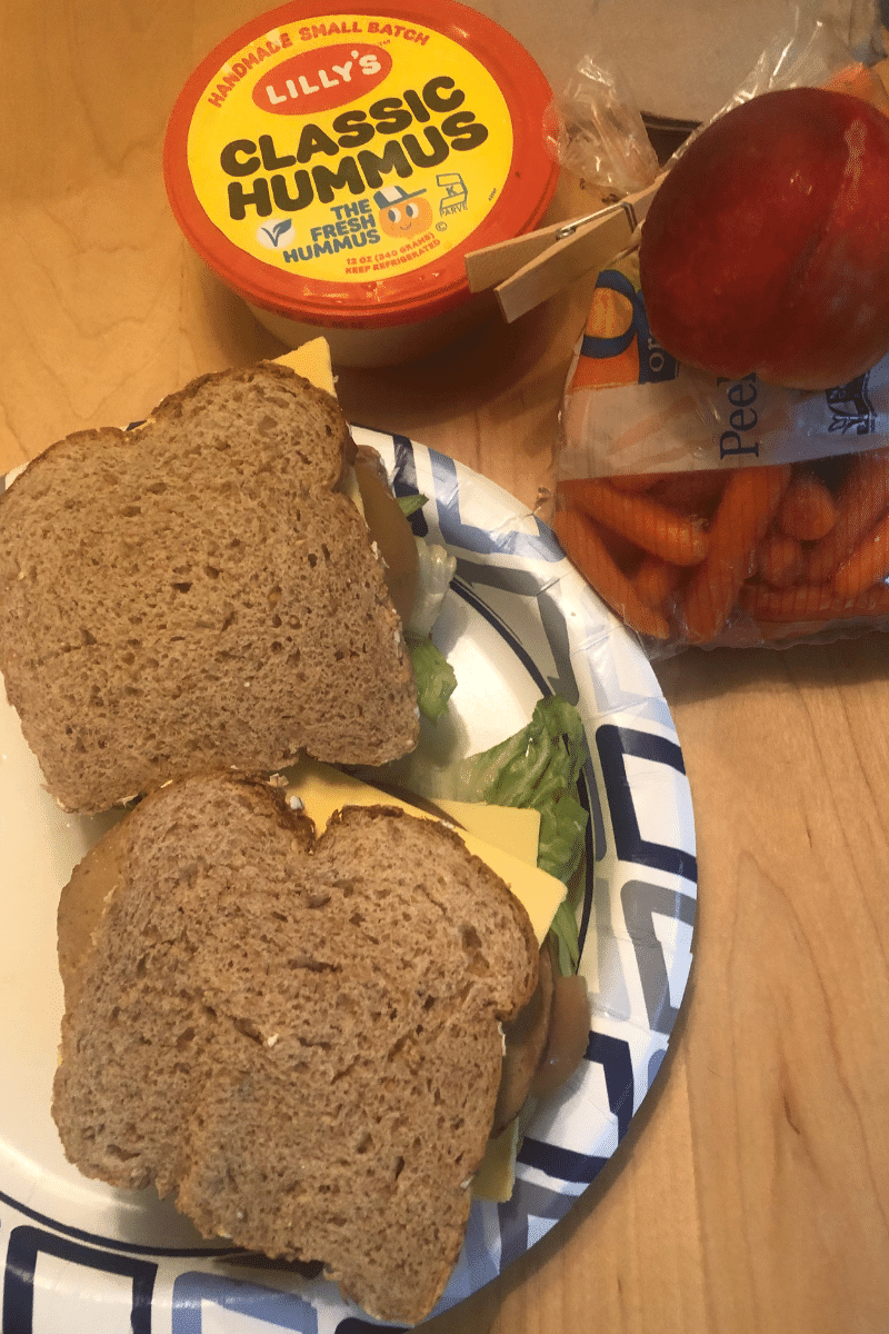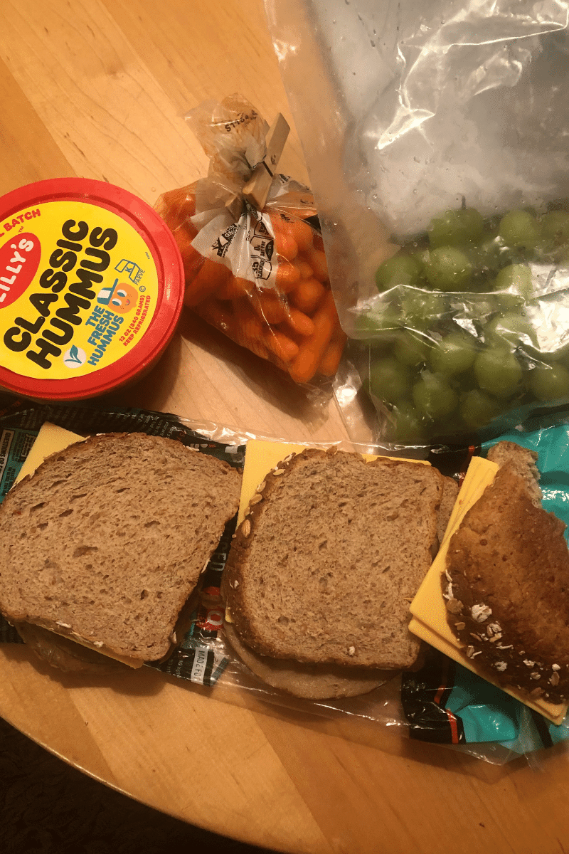 Instead, I had the rest of my bread, deli, and cheese slices, baby carrots with hummus, and some white grapes.