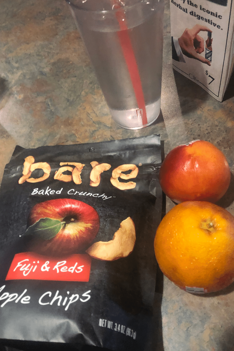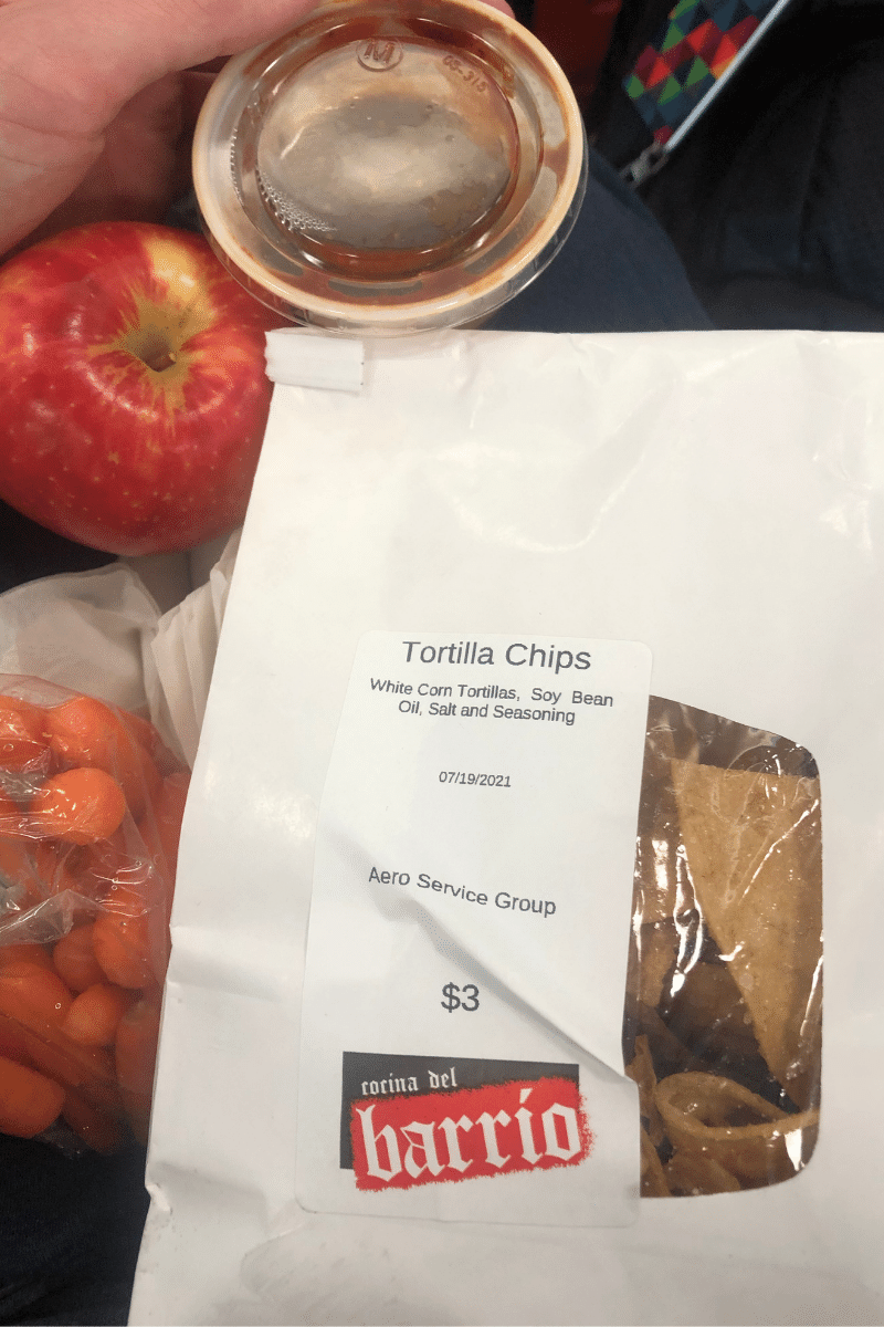 I tried some chips and salsa from Cocina del Barrio at the airport, which were no bueno. The chips tasted burnt while the salsa was weird, probably because it was made with tomatillos instead of tomatoes. One of my sisters liked and ate them. I also brought an apple and baby carrots from my parents’ place.
