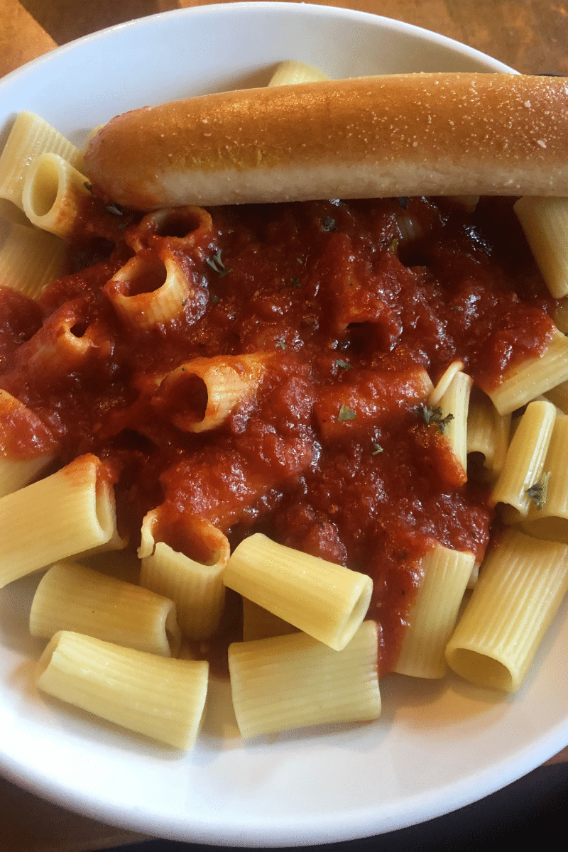 We ate at the Dimond Center Olive Garden for supper. I had a create-your-own pasta with rigatoni noodles with traditional marinara sauce on top, two bowls of minestrone soup, and six breadsticks.