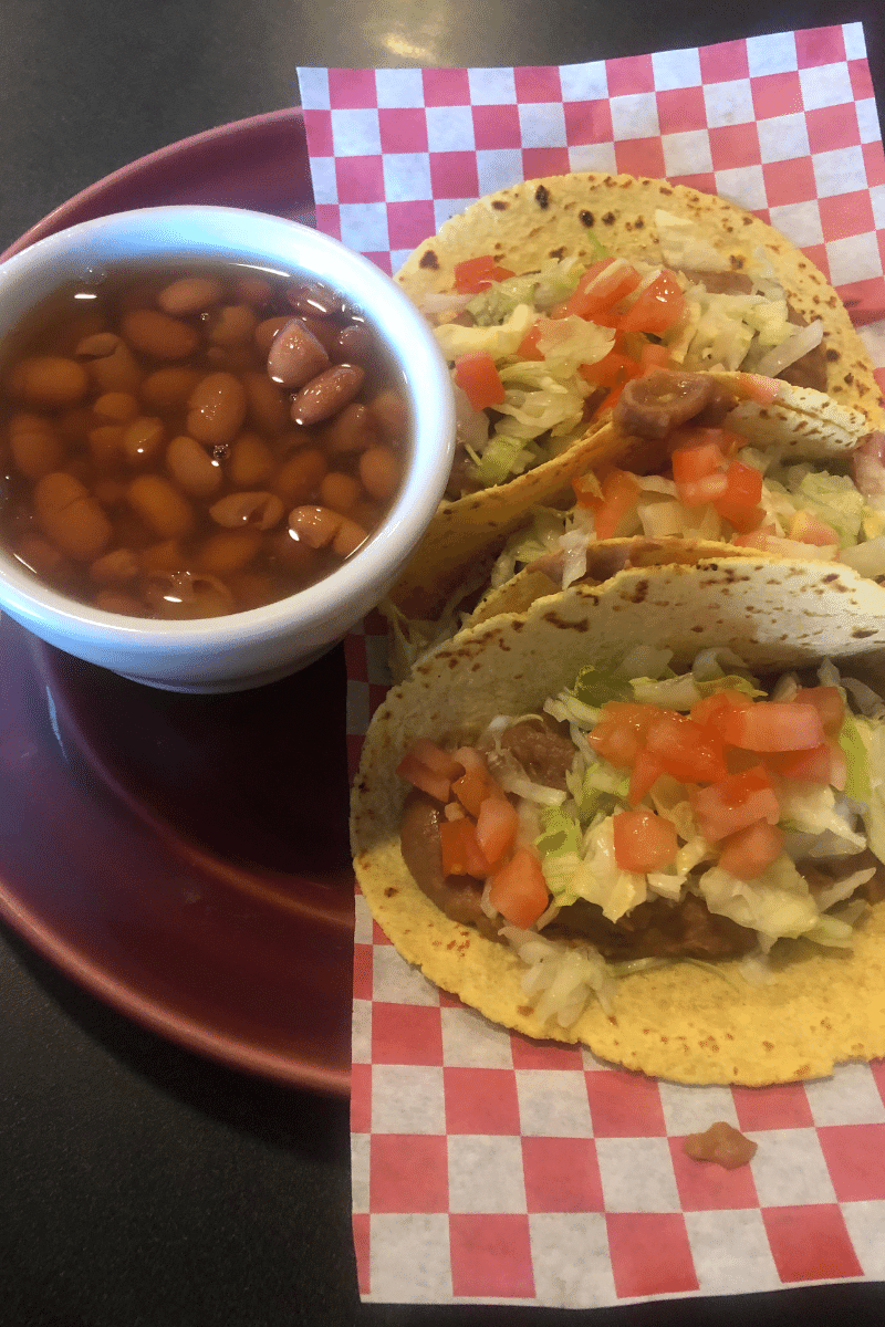 Supper options were sparse, but we found something with vegan options. Technically, nothing on the menu was vegan, but the workers were willing to make a special dish for me. I told the worker to make sure my dish had no meat, dairy, and lard, and they made me some small bean tacos with tomato, lettuce, and beans.
