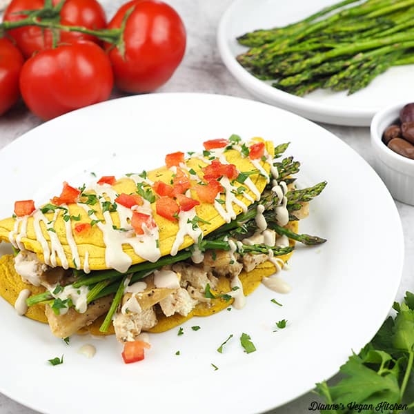 Full of asparagus and tofu feta, this Vegan Omelet is a terrific dish to serve at a spring brunch. It’s great for days when you’re craving breakfast for dinner, too!