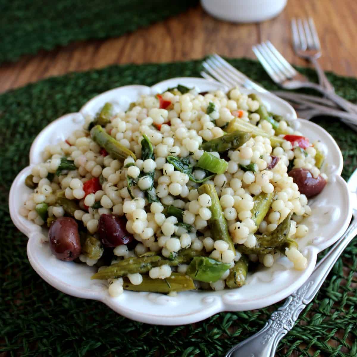 Pearl Couscous Salad has an array of veggies along with the Israeli couscous including asparagus & olives. A cold Mediterranean couscous salad is the best!