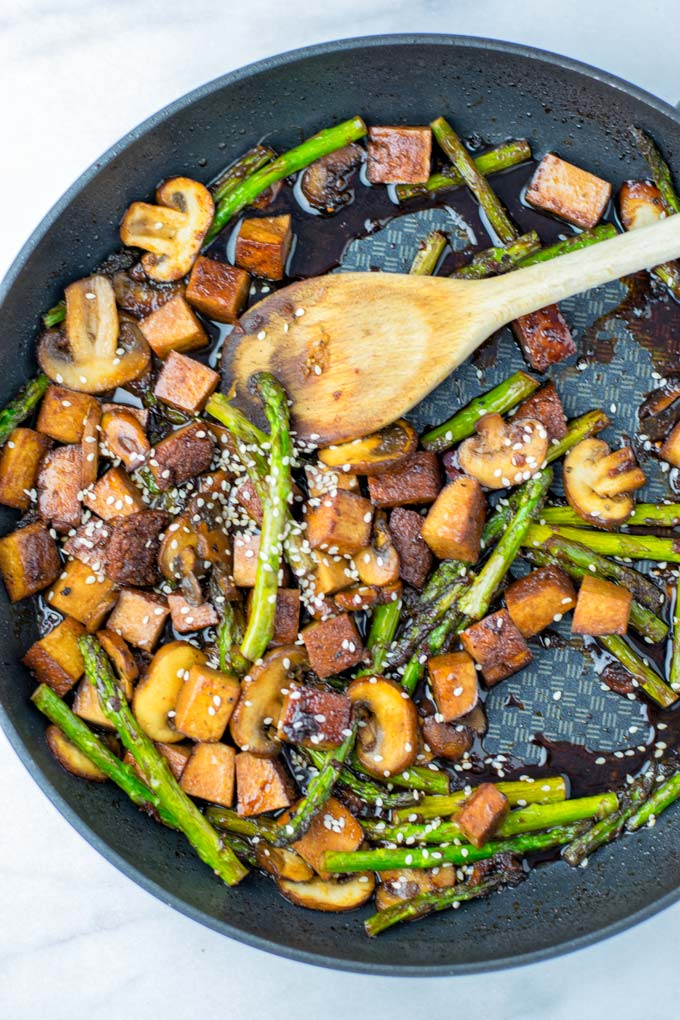 This vegan Asparagus Stir Fry is an easy healthy lunch or dinner. Made with tofu, a soy sauce, and extra mushrooms it is ideal for meal prep and work lunch.