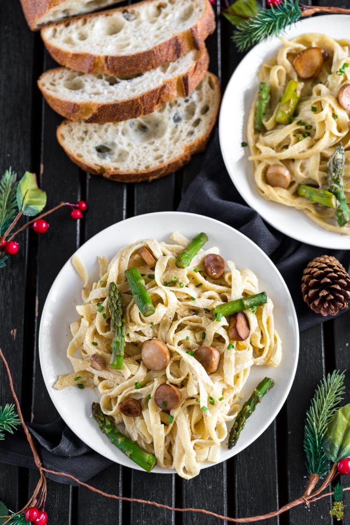 15. Asparagus Fettuccine Alfredo Fettuccine Alfredo gives me nostalgia for when my family and I made boxed fettuccine Alfredo as a kid. Here’s some scallop and asparagus fettuccine Alfredo from Sweet Simple Vegan.
