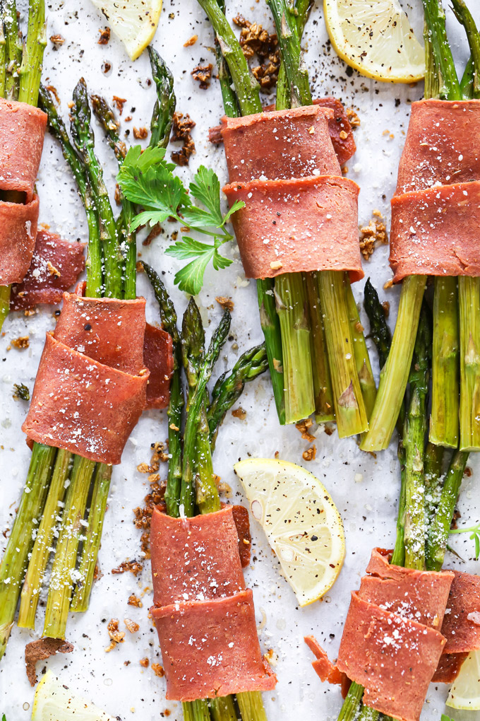 Vegan Bacon Wrapped Asparagus - Easy low carb crispy bacon wrapped asparagus topped with vegan parmesan & a sprinkle of lemon is just perfect.