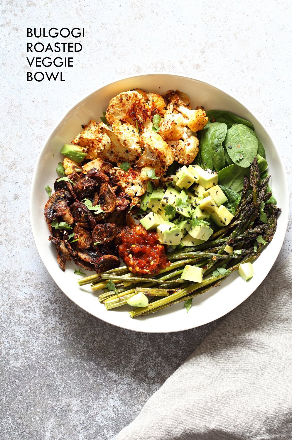Bulgogi Roasted Spring Veggie Bowl. Korean Gochugaru blend roasted Cauliflower Mushroom Asparagus Bowl. Vegan Gluten-free Nut-free Recipe Easily Soyfree