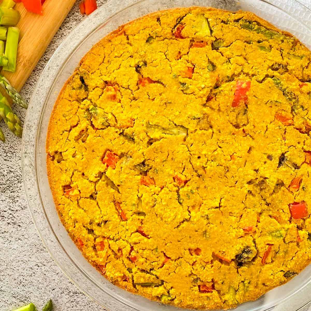 A vegan frittata featuring asparagus, peppers and mushrooms with an eggy chickpea flour batter. It’s packed with flavour, and simple to prepare!