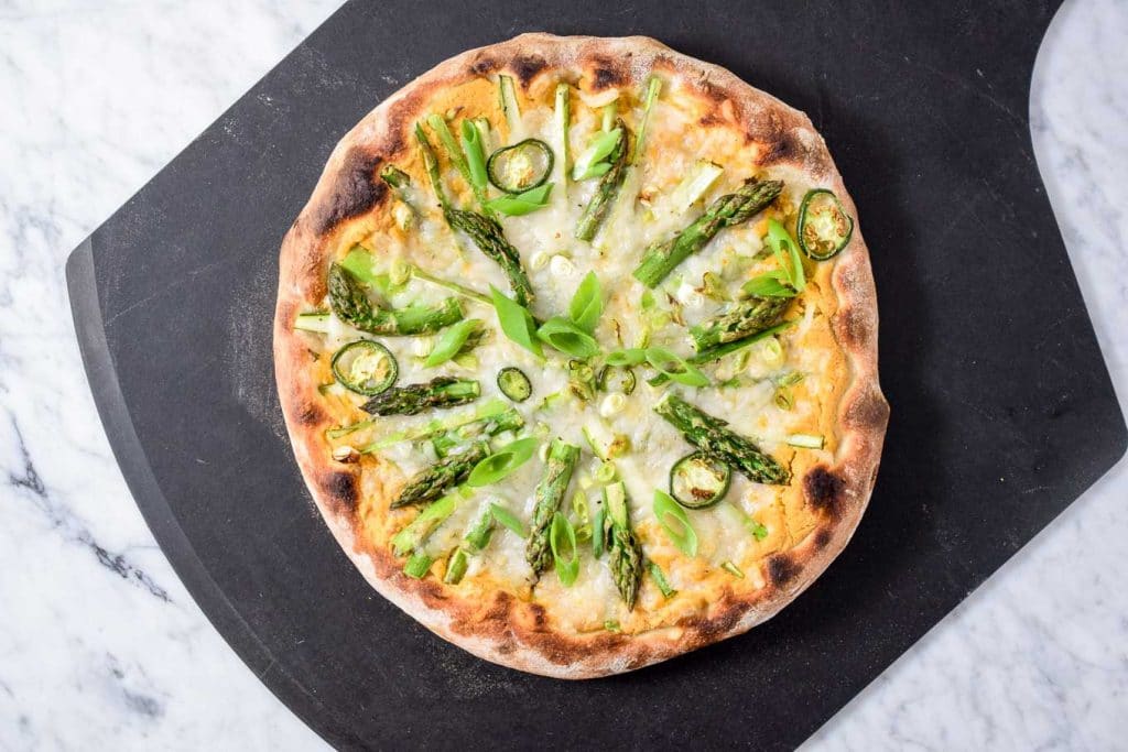 A spicy chickpea sauce is the base for this mouth-watering springtime themed vegan pizza topped with asparagus, jalapeño, and green onions.