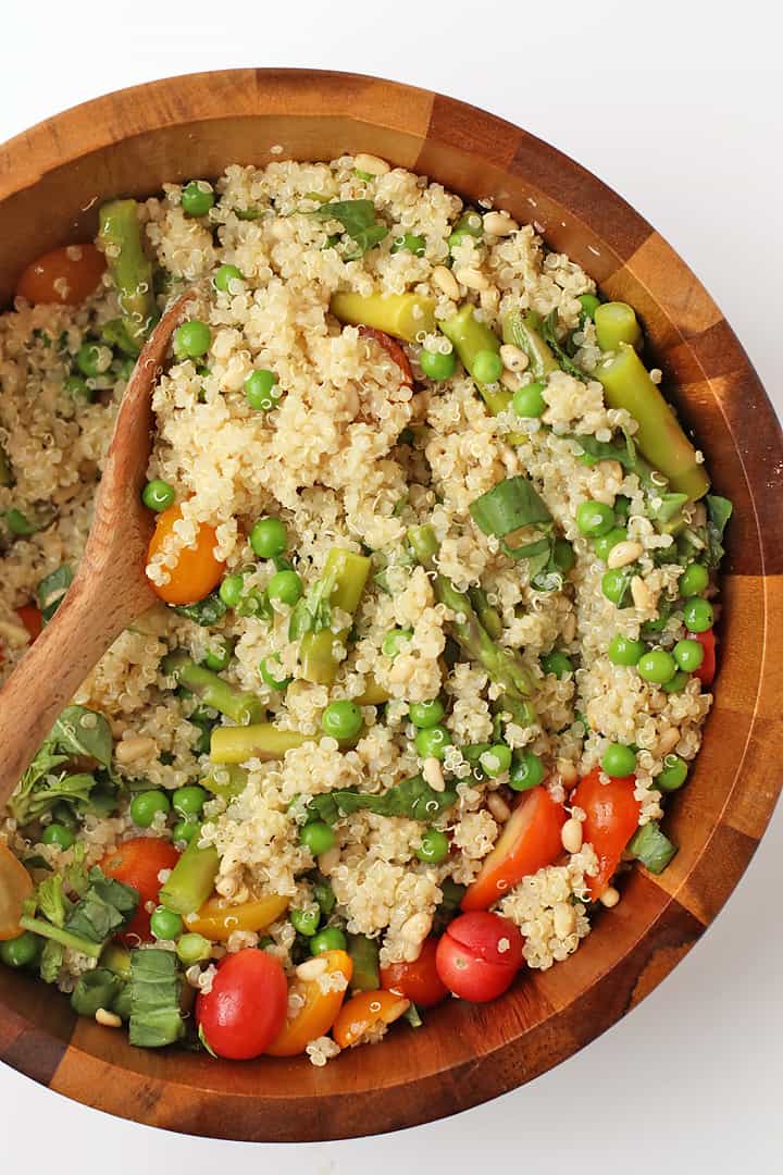 This easy vegan quinoa salad is mixed with asparagus, peas, and fresh basil then tossed in a lemony vinaigrette for a quick and simple springtime salad. Made in just 30 minutes.