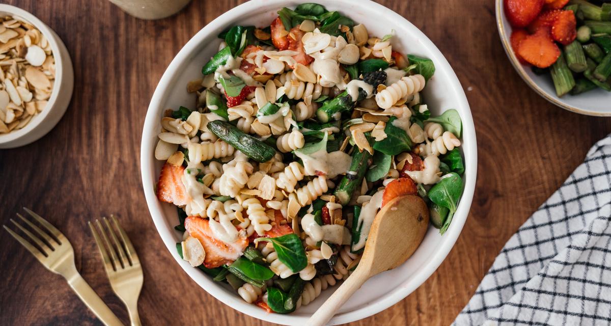 A quick and easy vegan pasta salad with strawberries and green asparagus. Perfect for bbq or a picnic and ready in just 20 minutes.