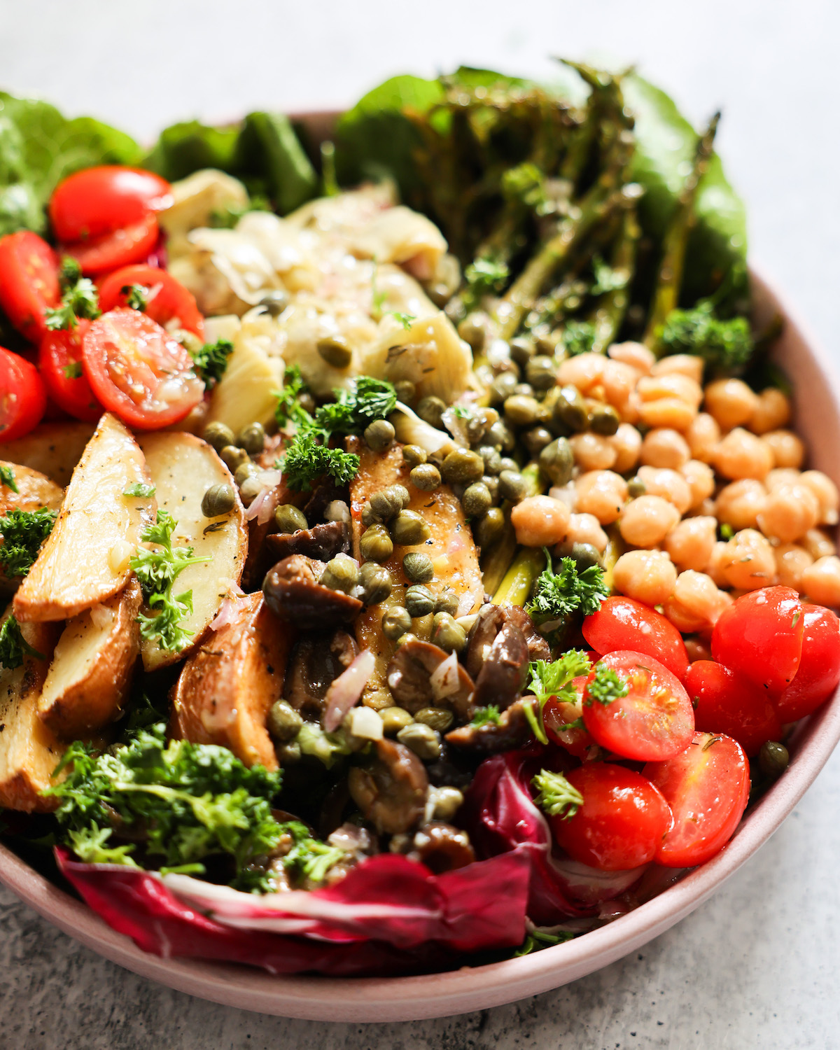 Vegan Nicoise Salad is vibrant, hearty, and delicious. With chickpeas, artichoke hearts, and roasted potatoes, you’ll never miss the tuna!