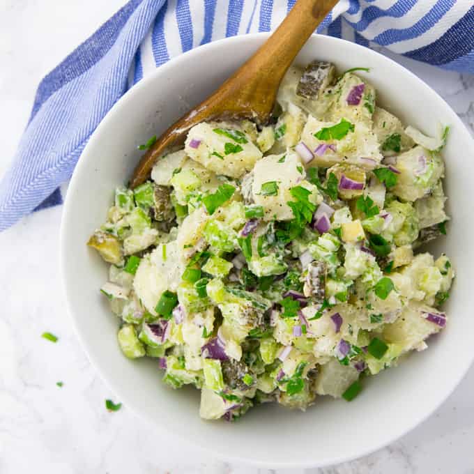 Potato salad ingredients (vegan mayo, potatoes, and celery)