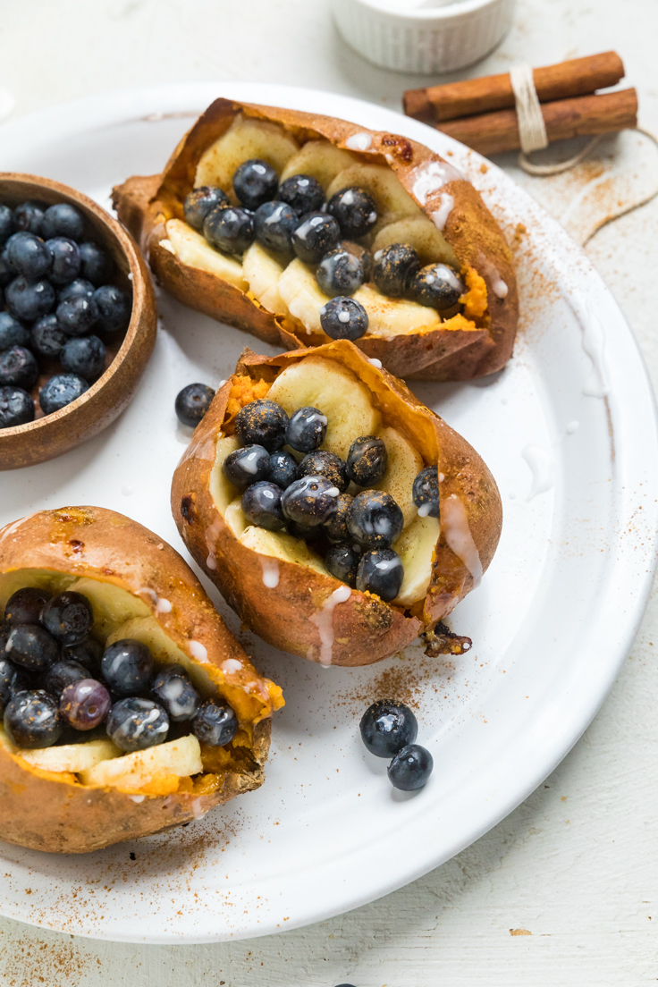 If you want to give this a try, make blueberry and banana stuffed sweet potatoes from Make It Dairy Free.