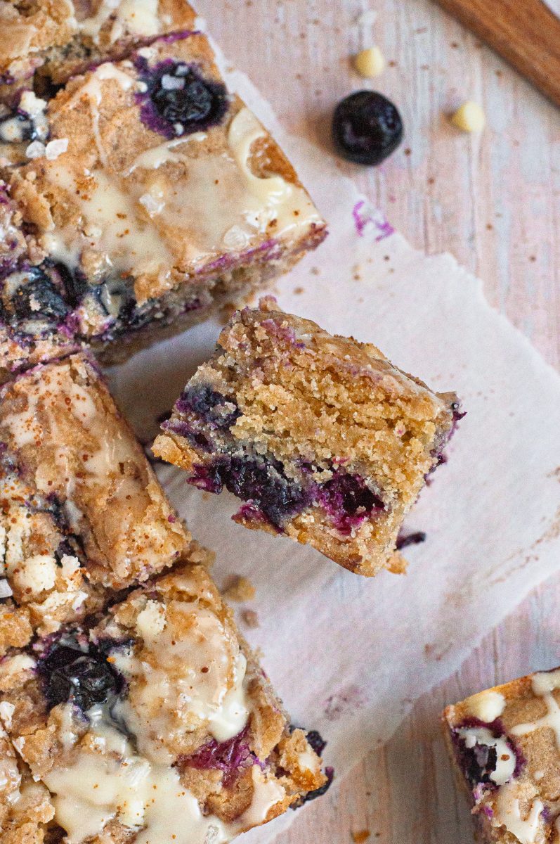 If you're in the mood for a brownie but want something a little less chocolatey, blondies would be a good dessert option for you. For example, create blueberry blondies with the help of Caked by Katie.