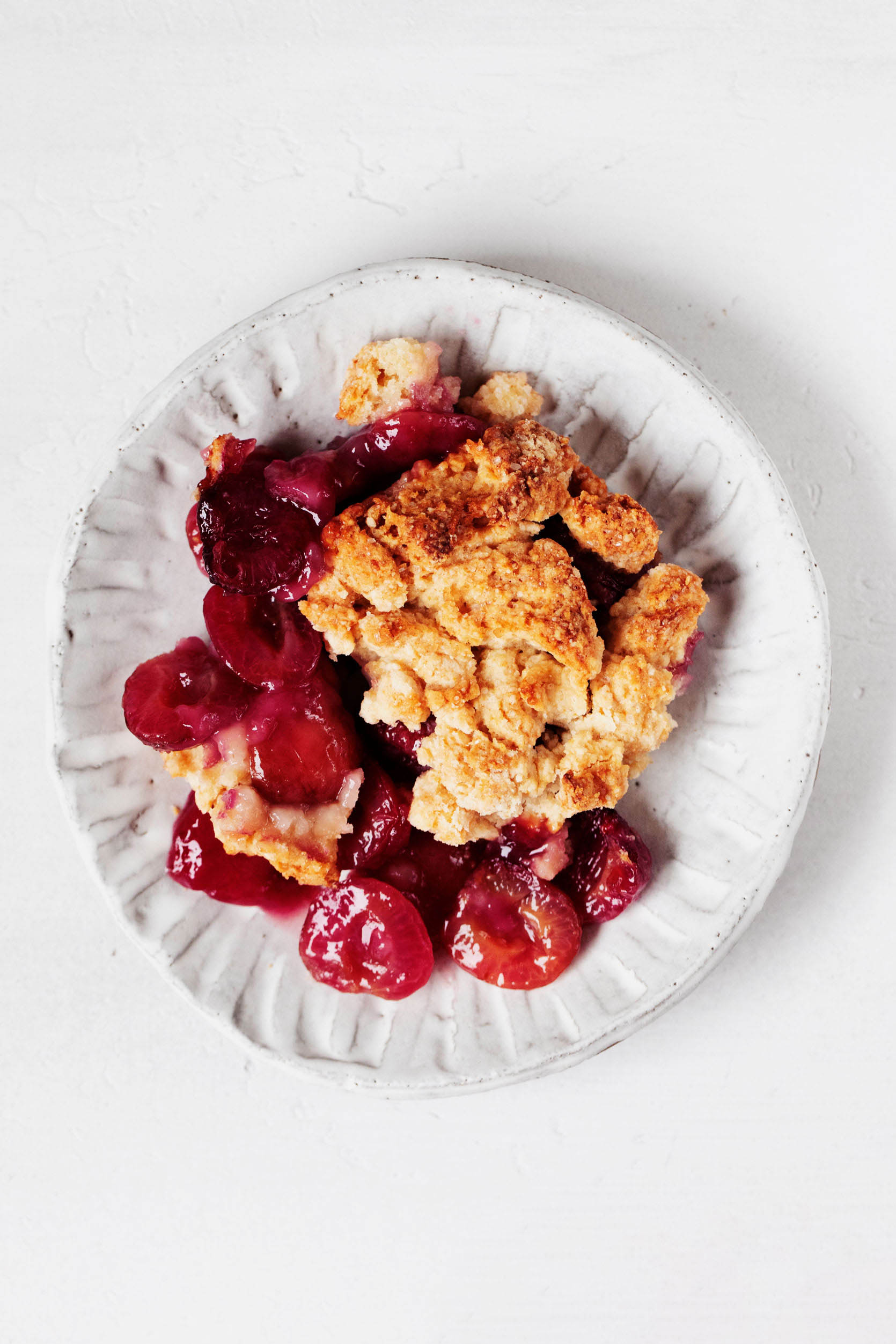 This vegan cherry cobbler uses dark sweet cherries for a beautifully juicy filling! Topped with a rustic biscuit crust that’s easy to make.