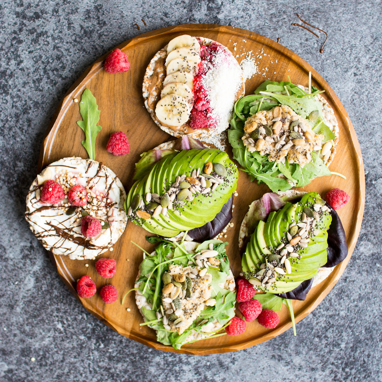 Spread on some nut butter for protein and healthy fats, layer mashed avocado for creamy richness and heart-healthy fats, or top with hummus and veggies for a refreshing, fiber-rich snack.