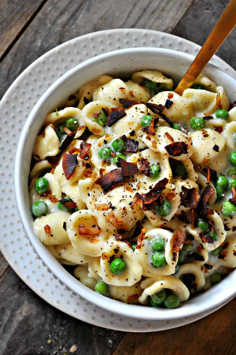 Vegan Creamy Bacon and Pea Orecchiette