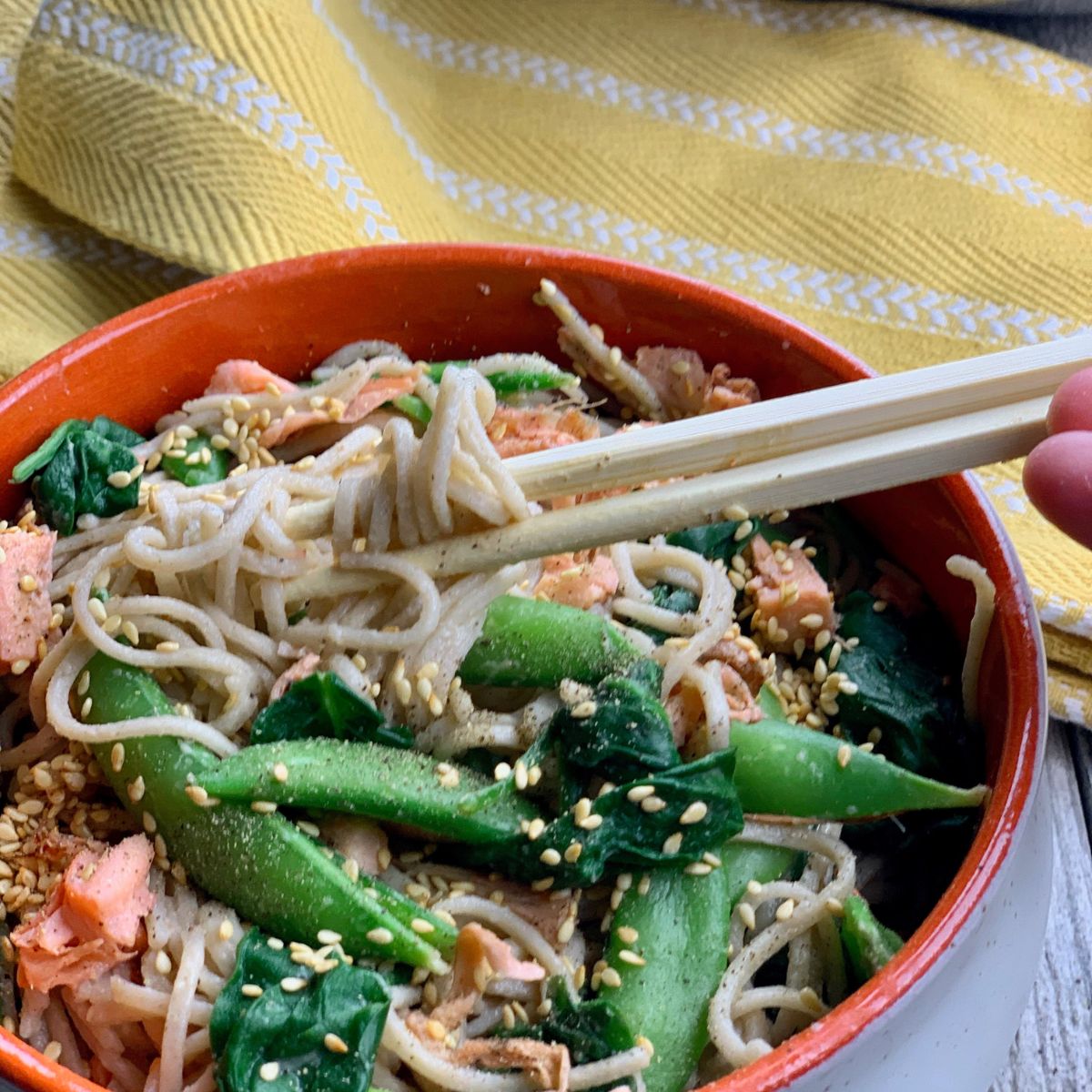 5. Spicy Pea Soba Noodles Soba are Japanese buckwheat noodles that are pretty tasty. Here are some jackfruit and sugar snap pea soba noodles from Plant Based Foody.