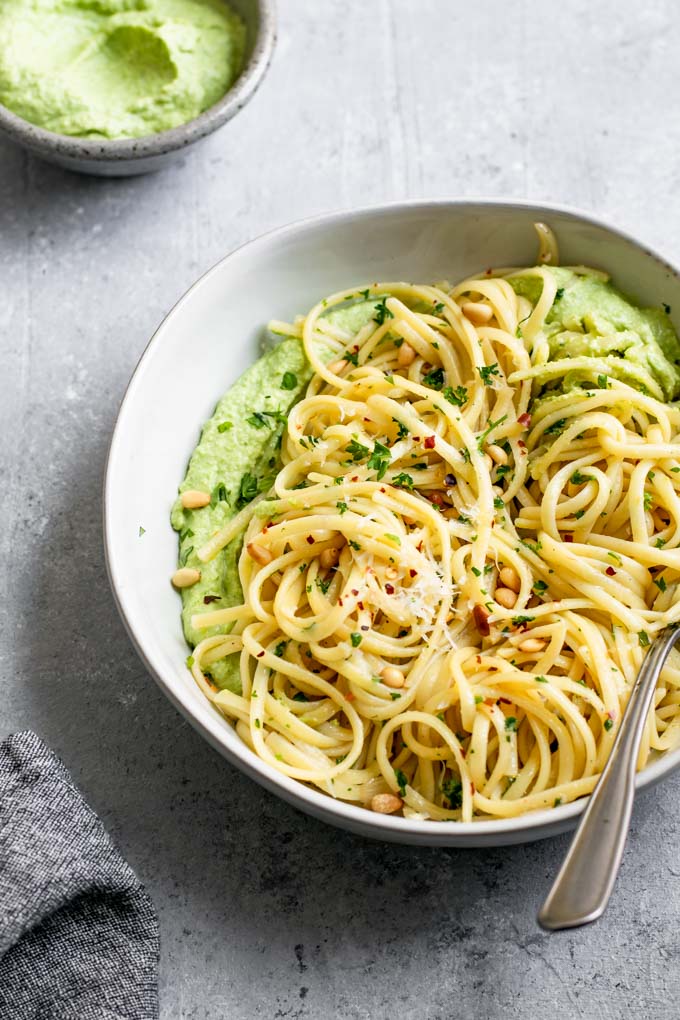 This mouth watering olive oil and garlic linguine is served atop an easy vegan whipped pea ricotta. It’s a delicious dinner and easily made gluten free!
