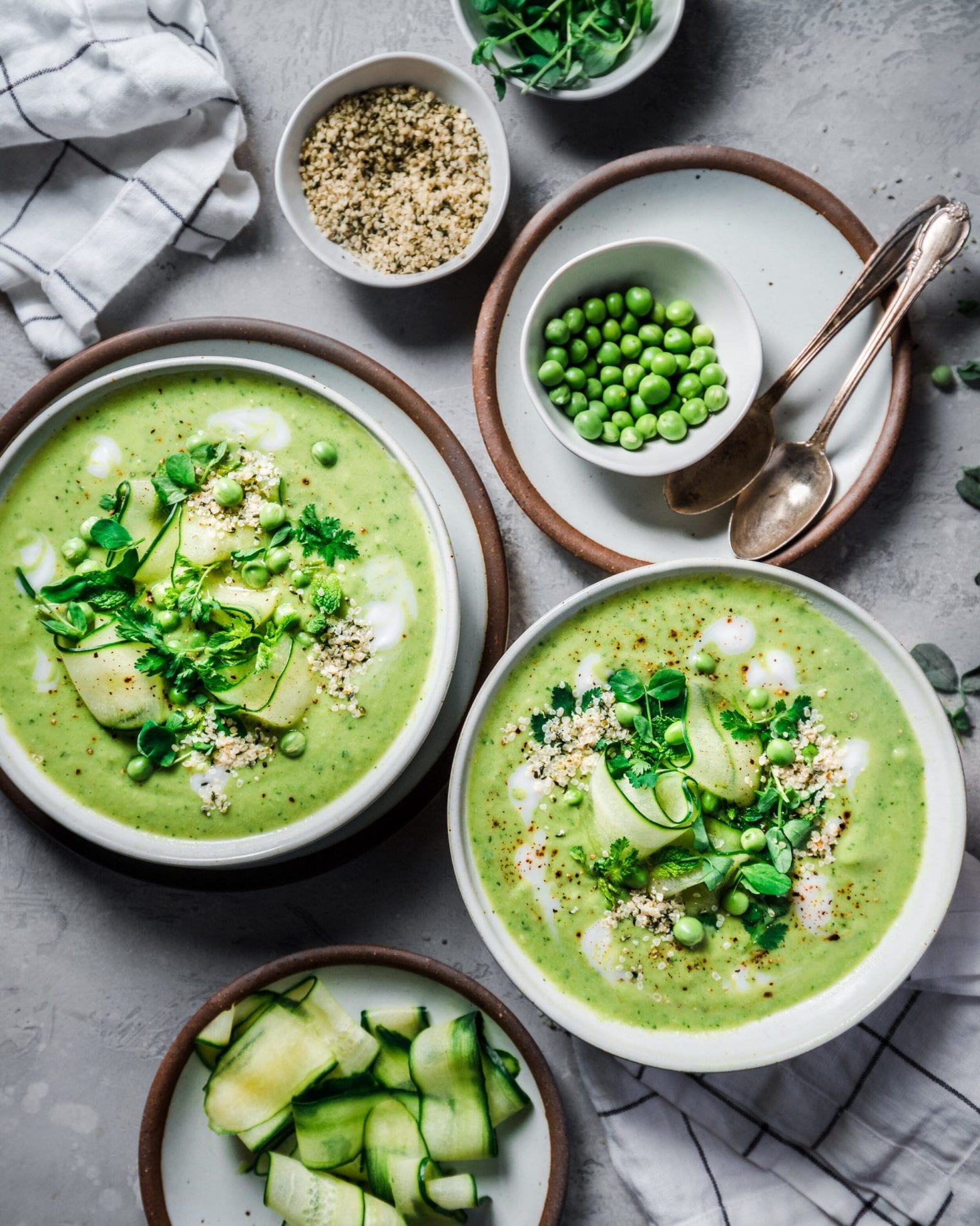 This Creamy Avocado Pea Gazpacho is made with wholesome ingredients like avocados, peas, cucumbers, lime juice, cilantro, and coconut milk, but is surprisingly creamy and satisfying. The perfect no-cook, 10-minute lunch or light dinner for hot days.