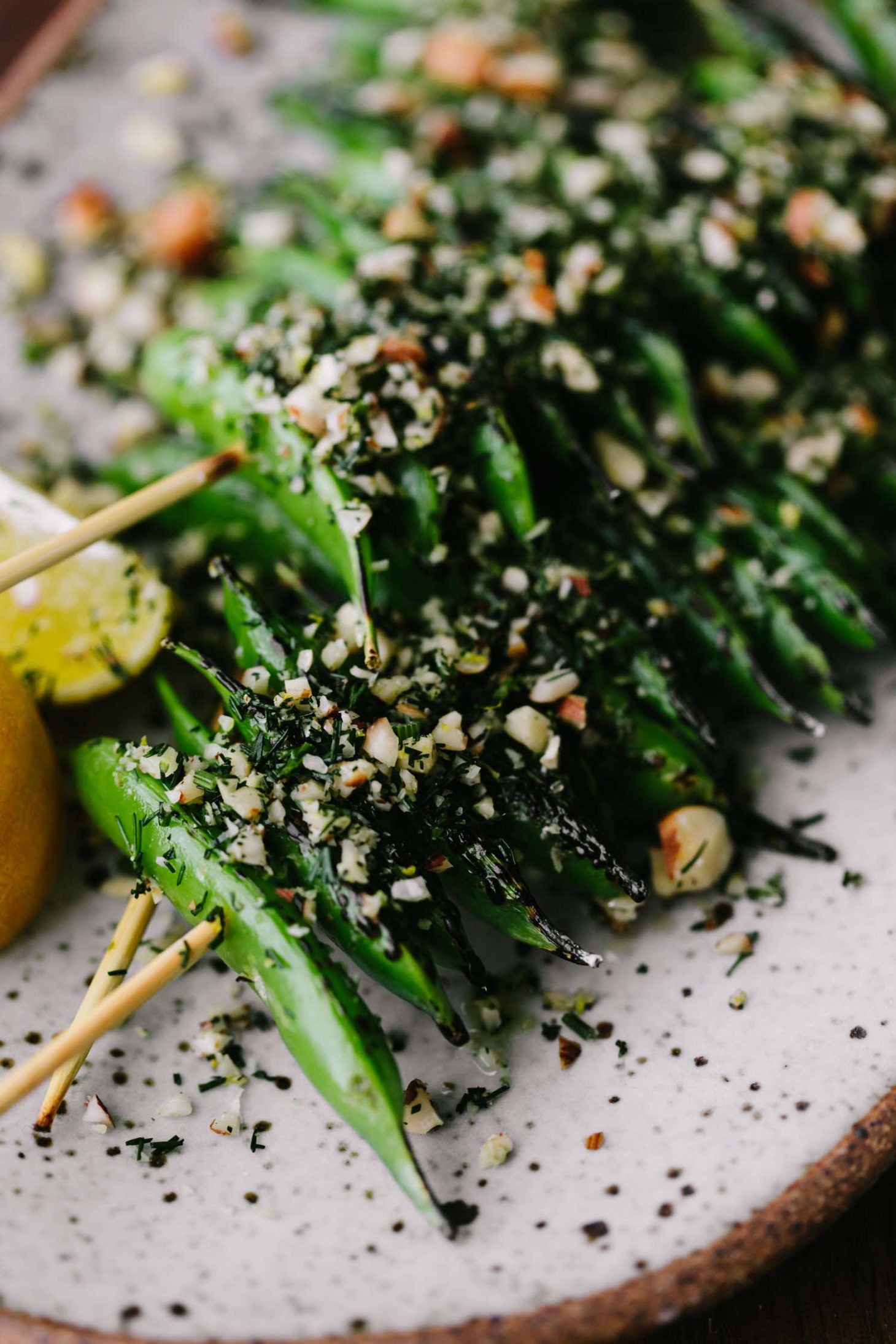 Grilled Snap Peas with Hazelnut-Dill Crumb