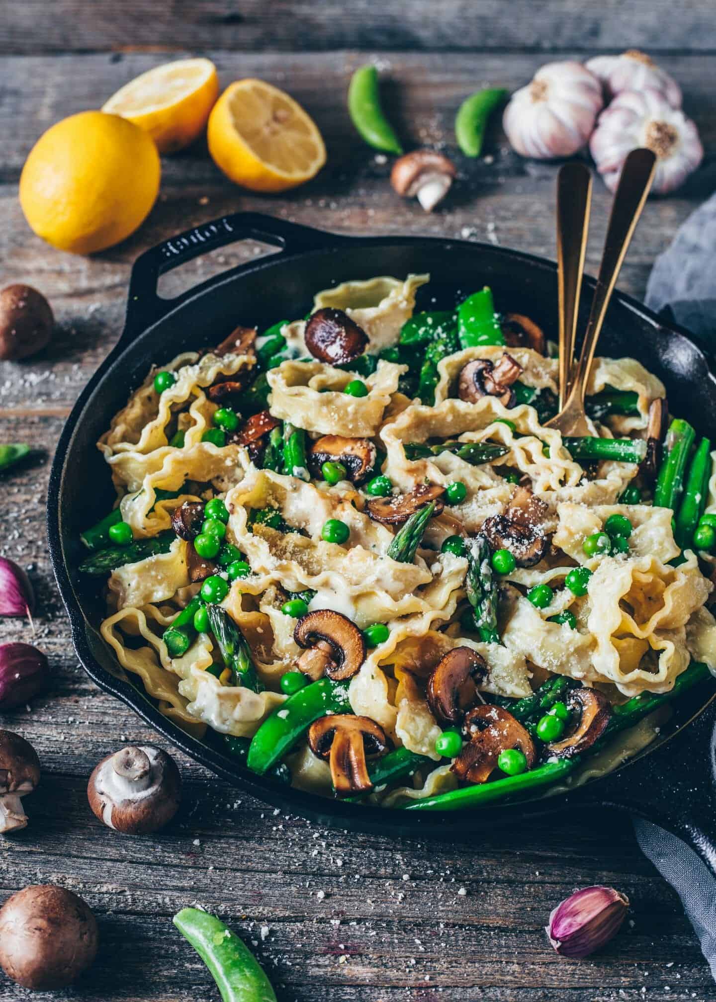 This Pasta Primavera with Asparagus, Mushrooms and vegan parmesan is a healthy and delicious creamy pasta recipe that is easy to make in under 30 minutes!