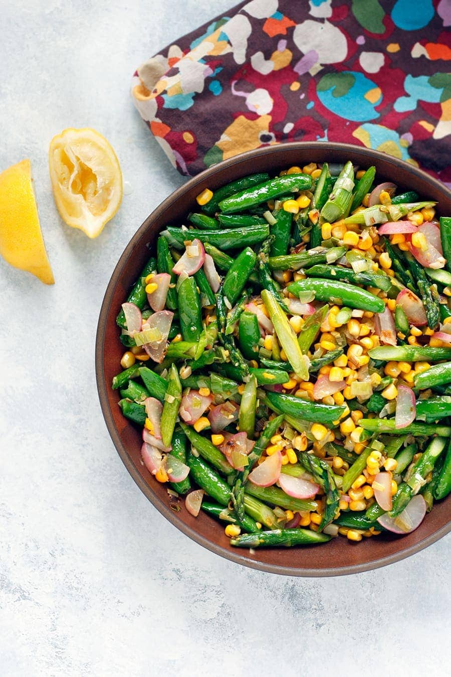 This spring vegetable stir-fry is super colorful and flavorful with the help of green asparagus and sugar snap peas, pink radishes and yellow corn.