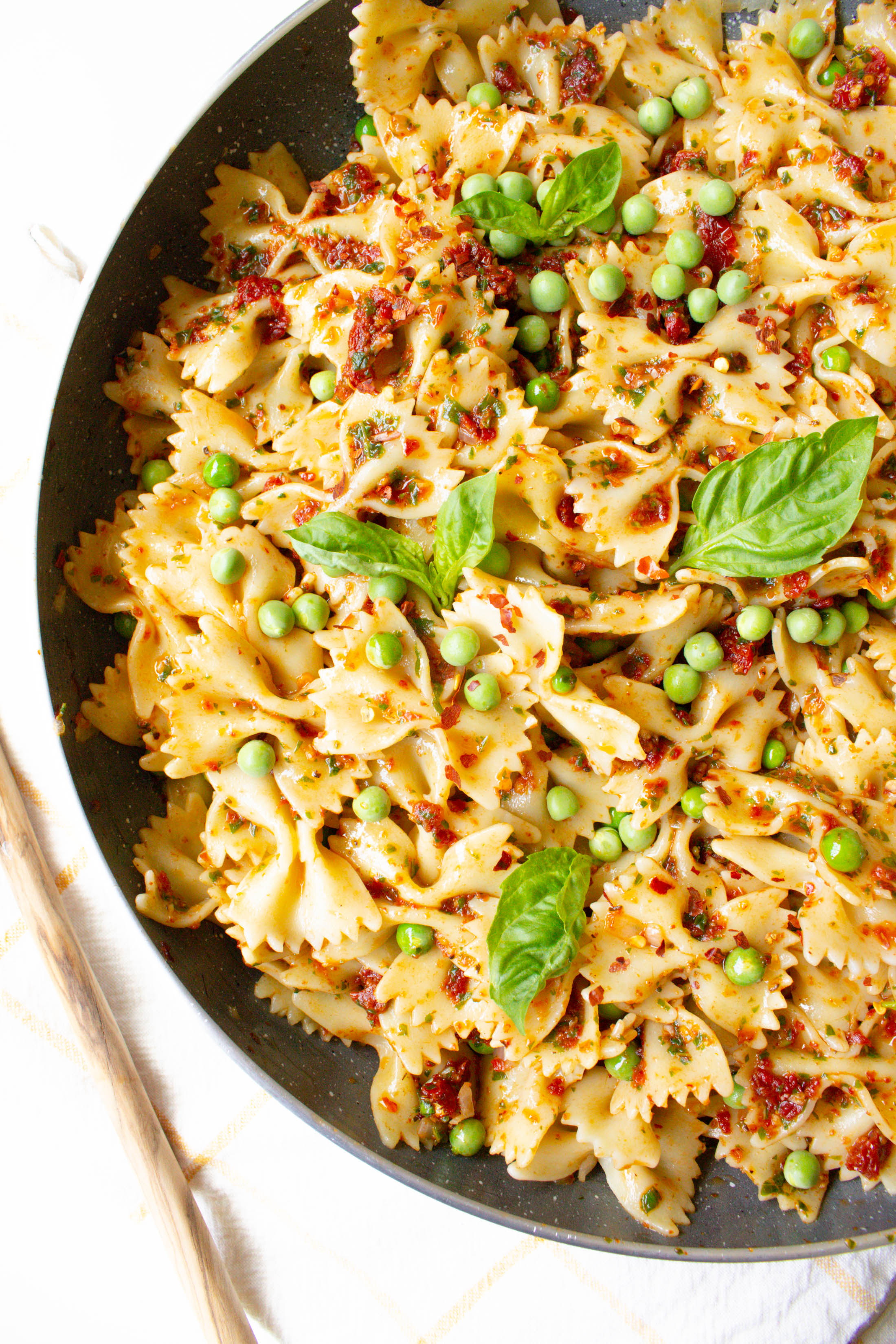 This Vegan Sun-Dried Tomato Pesto Pasta with Spring Peas is a quick dinner - ready in less than 30 minutes and filled with bright and fresh flavors.
