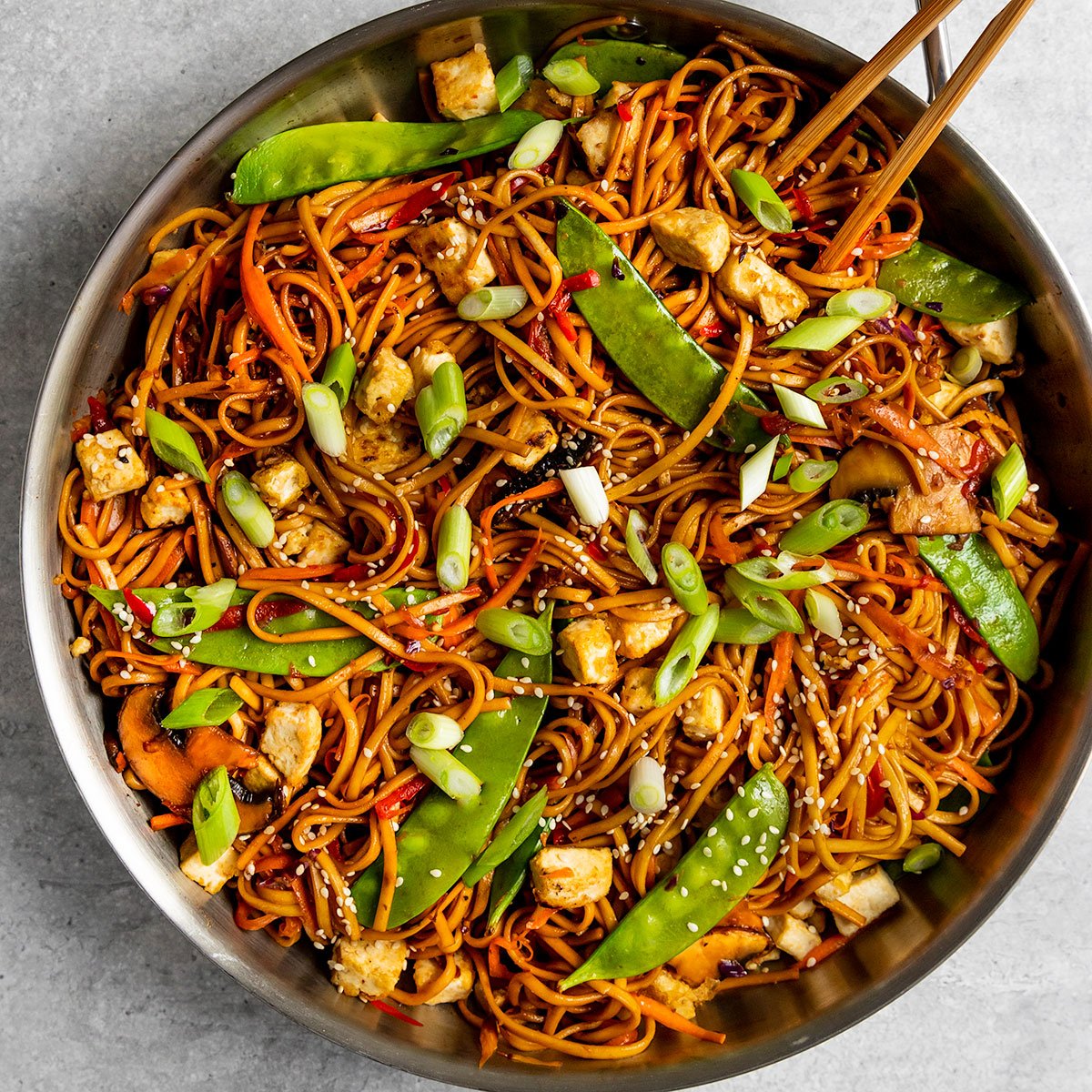 The BEST Vegan Tofu Lo Mein recipe filled with crispy tofu, tons of vegetables, and an easy 5 ingredient stir-fry sauce!