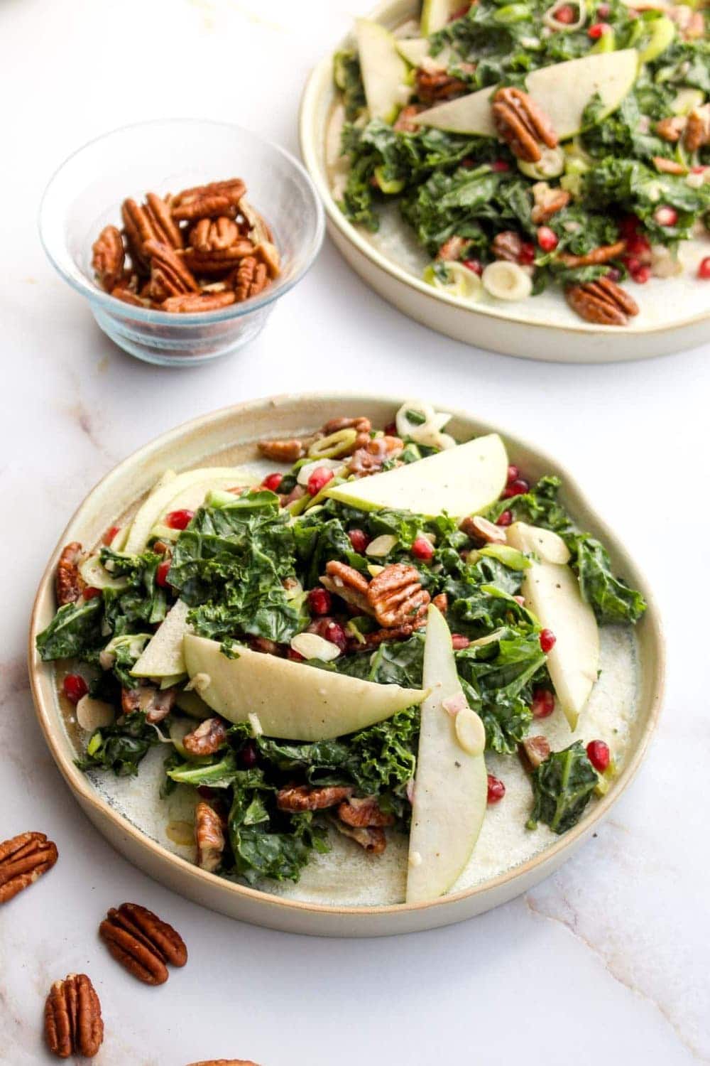 Winter Kale Salad is full of juicy pears, crunchy pecans, tart pomegranate arils, and a creamy vegan maple tahini dressing. A festive holiday side recipe!