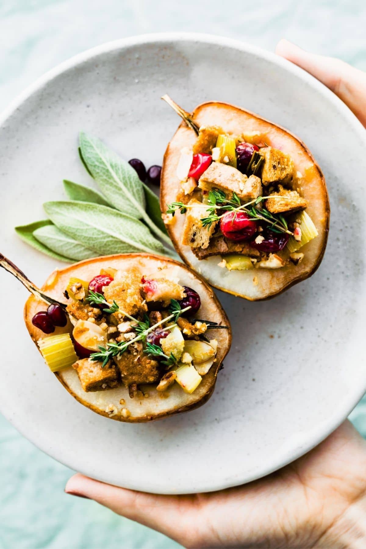 Baking pears with vegan stuffing is a unique, healthier way to serve traditional dressing! Make this recipe for a healthier holiday side.