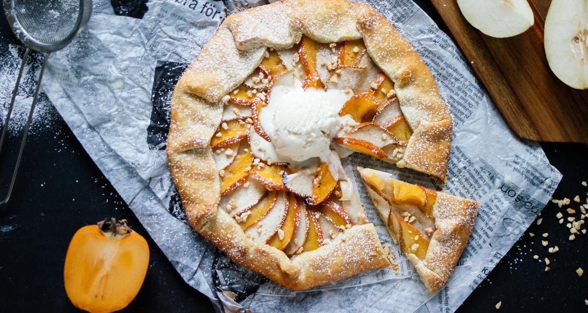 A quick and easy recipe for a vegan galette with pear and persimmon. Fresh from the oven, it’s the perfect dessert for sharing with friends.