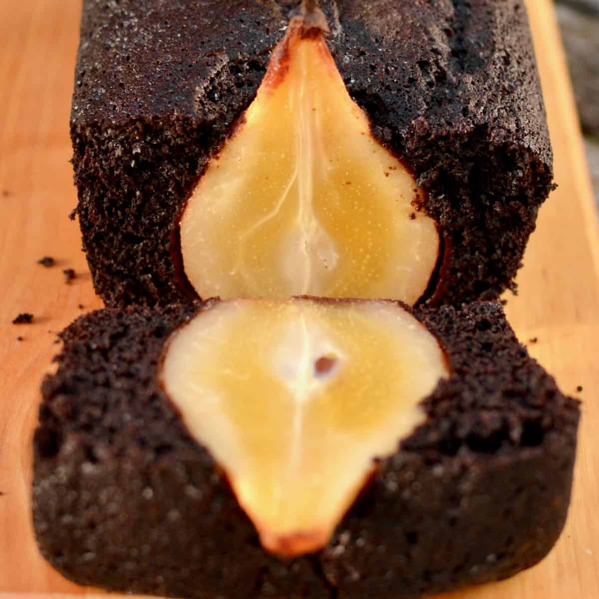 Looking for a tasty vegan pear cake? Try this dark chocolate loaf cake with whole pears. It looks impressive, but is very easy to make!
