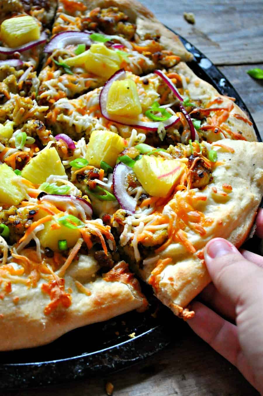 This Jamaican jerk pizza is so delicious! Topped with tempeh sausage crumbles tossed in jerk sauce, pineapple, red onion and vegan cheese.