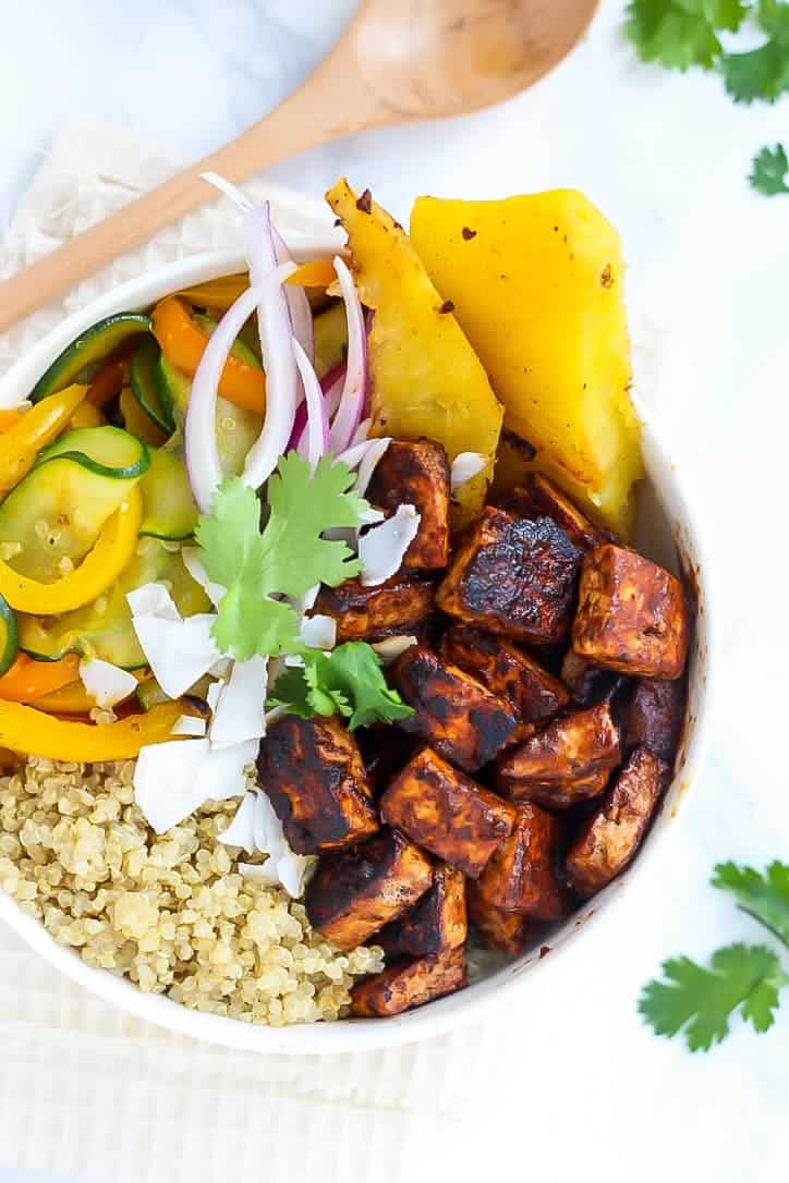 3. Pineapple BBQ Tofu Bowls Food bowls are excellent for sack lunches and lighter meals. Here is a pineapple BBQ tofu bowl recipe from Emilie Eats.
