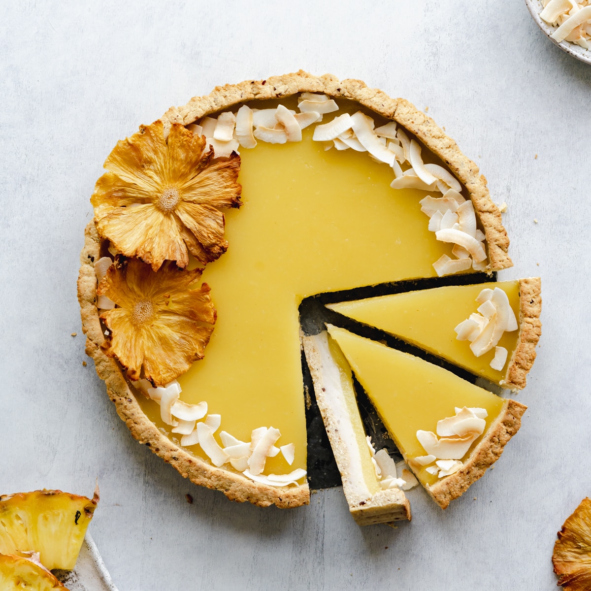 Vegan Panna Cotta Tart with tropical flavours of coconut panna cotta and pineapple curd jelly on top of a shortbread crust.