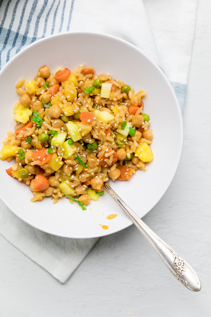 This Vegan Pineapple Fried Rice is the perfect dairy free dinner for a busy night! Quick, healthy, and ready in under 30 minutes!