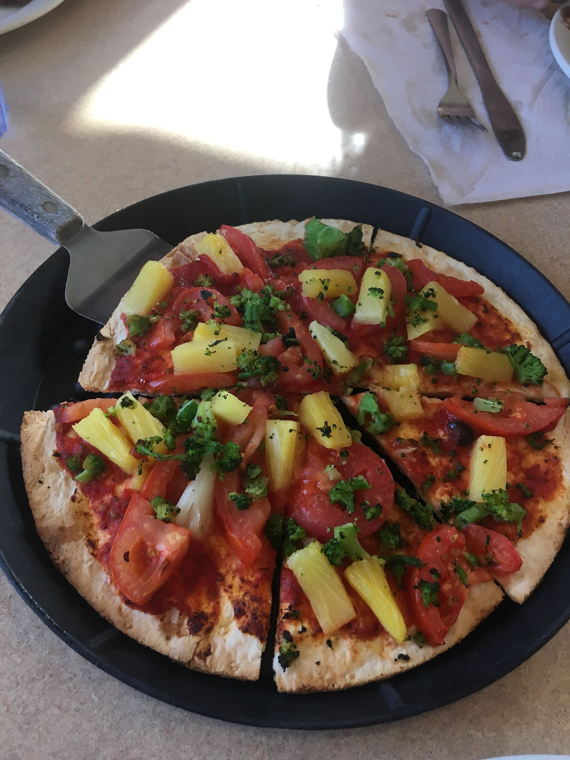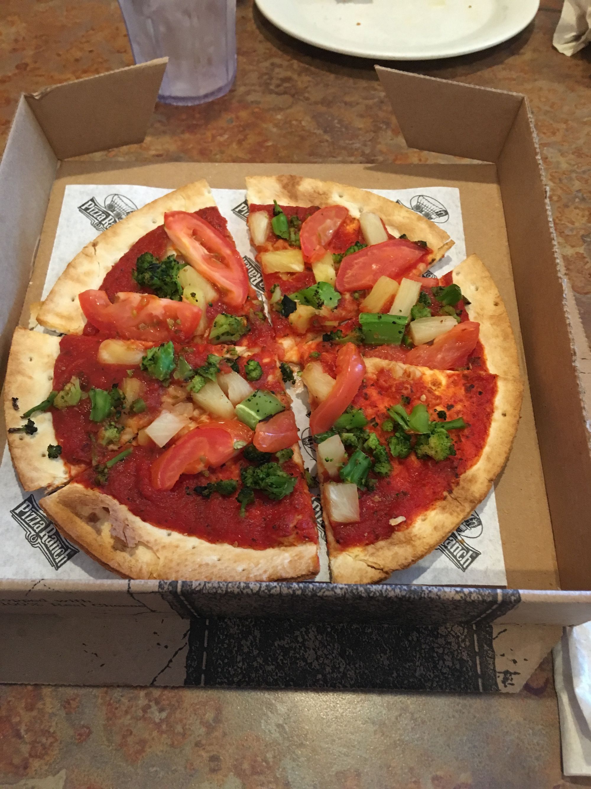 The biggest pizza chain in Iowa is Pizza Ranch, and I bet it will be considered a national franchise in 5-10 years. Naturally, with my family being Pizza Ranch’s biggest fans and consumers, I find it easy to get vegan options from Pizza Ranch when I’ve ordered it 50+ times in the past five years. My normal custom-made pizza is a cheeseless pizza with broccoli, pineapple, and tomato slices with no cheese. Regular crust and pizza sauce are vegan, and there is even a salad bar.
