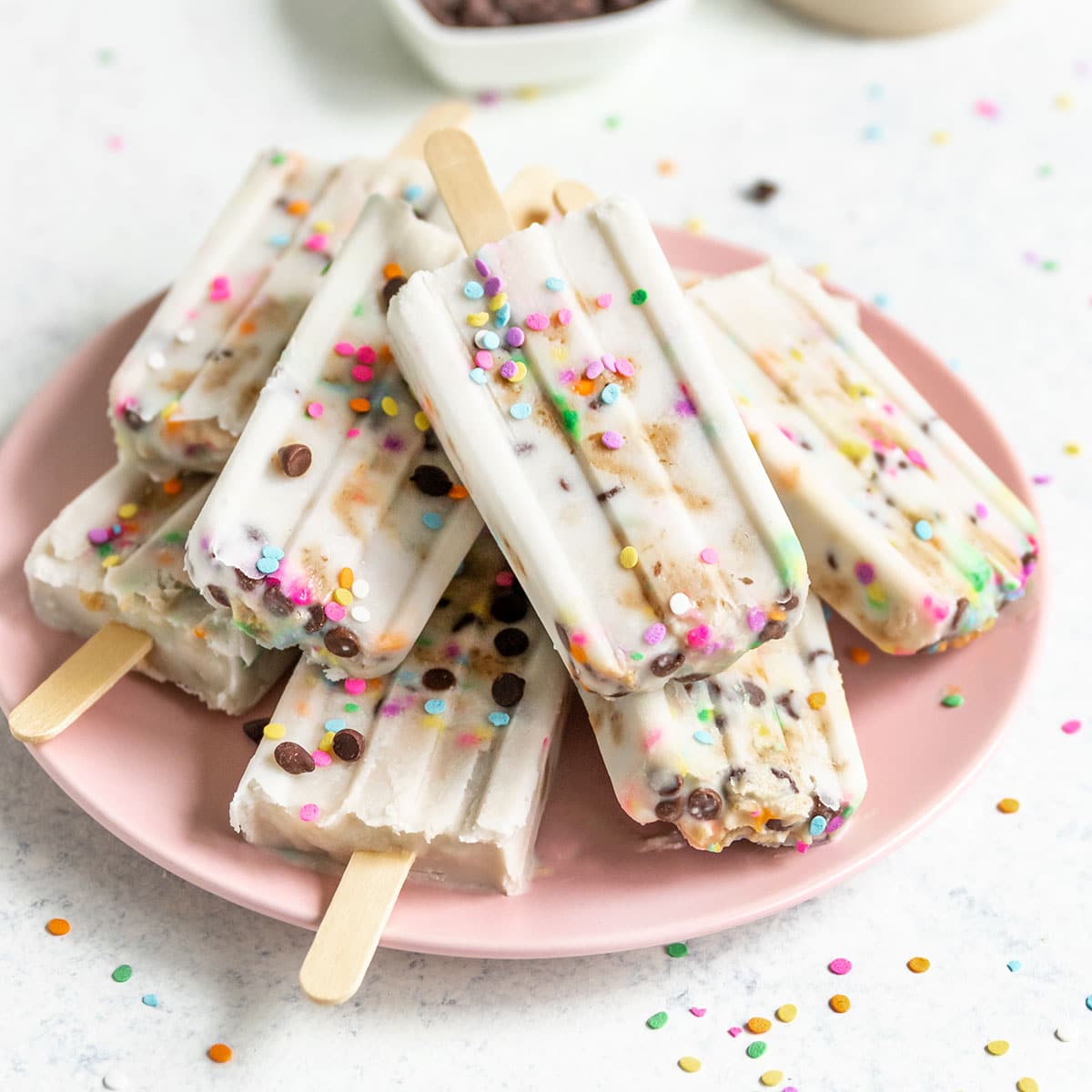 The creamiest Vegan Cookie Dough Popsicles made with homemade edible cookie dough, chocolate chips, & rainbow sprinkles!