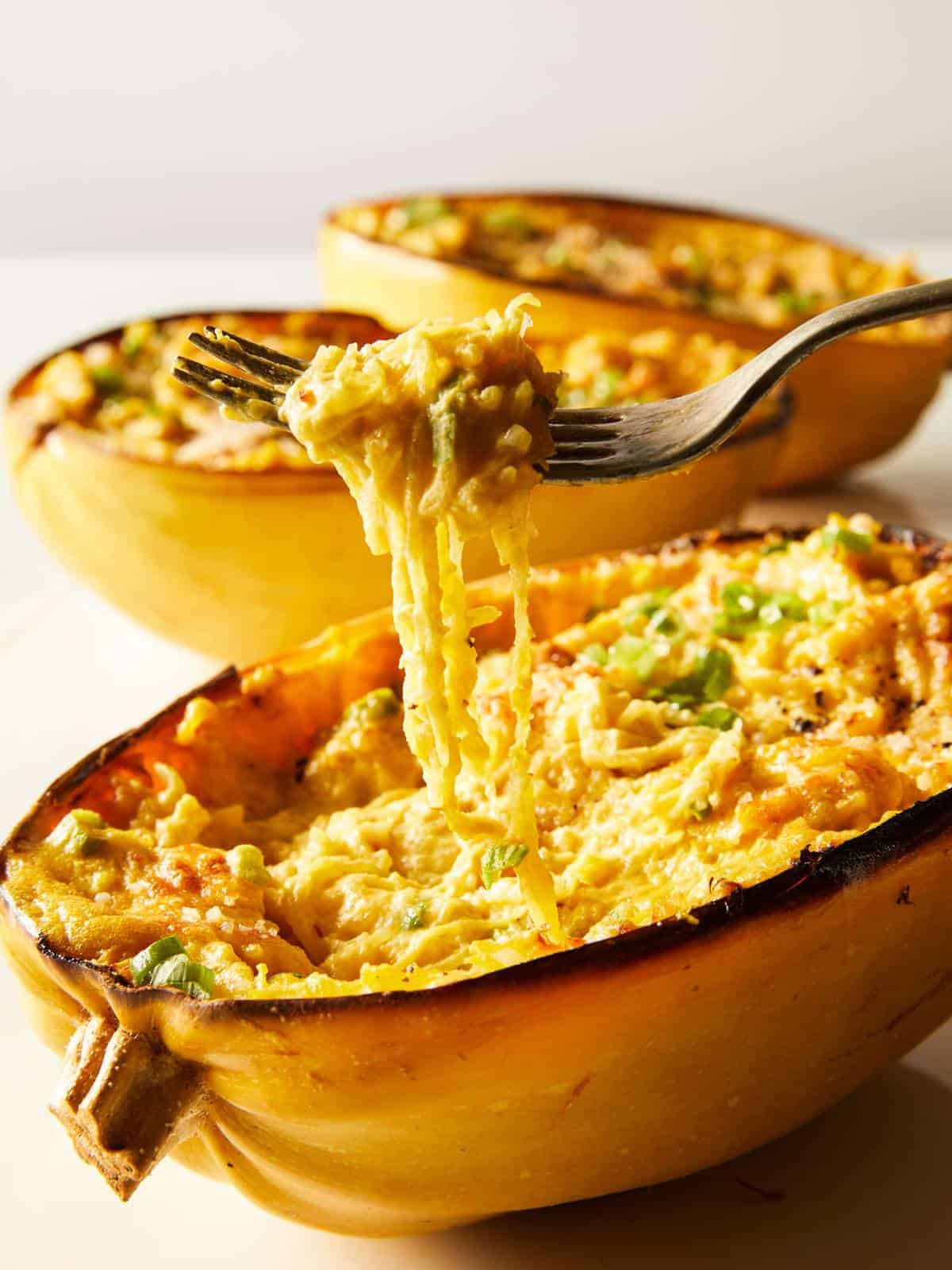 Vegan Baked Spaghetti Squash with Pumpkin and Green Onion Alfredo