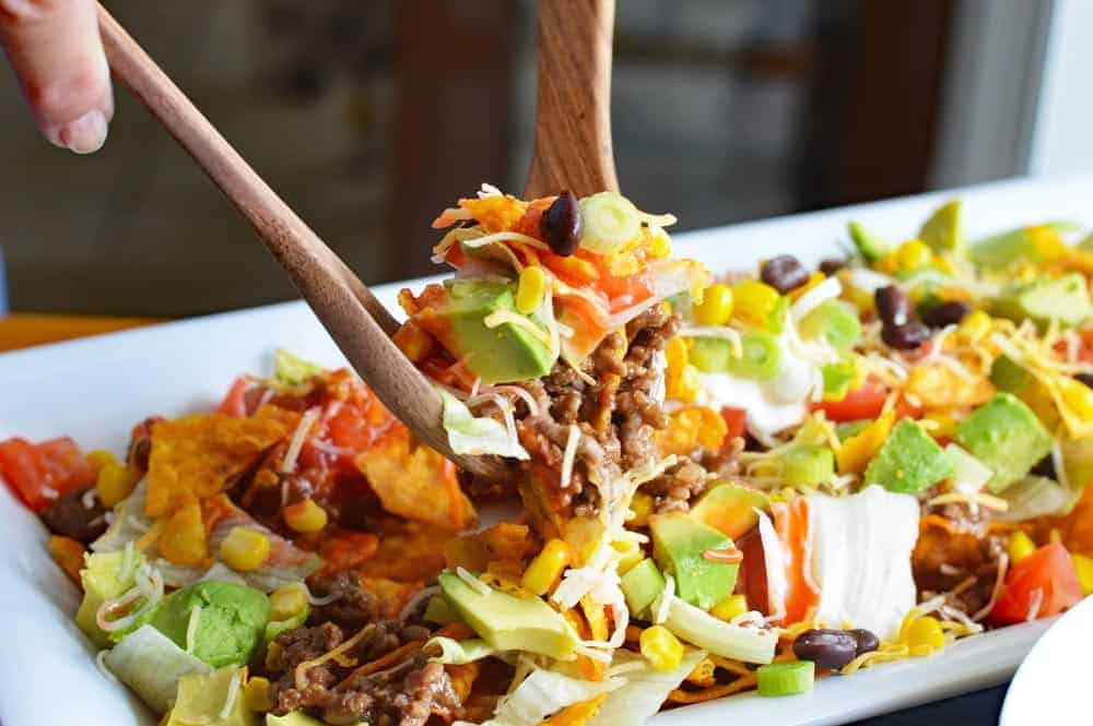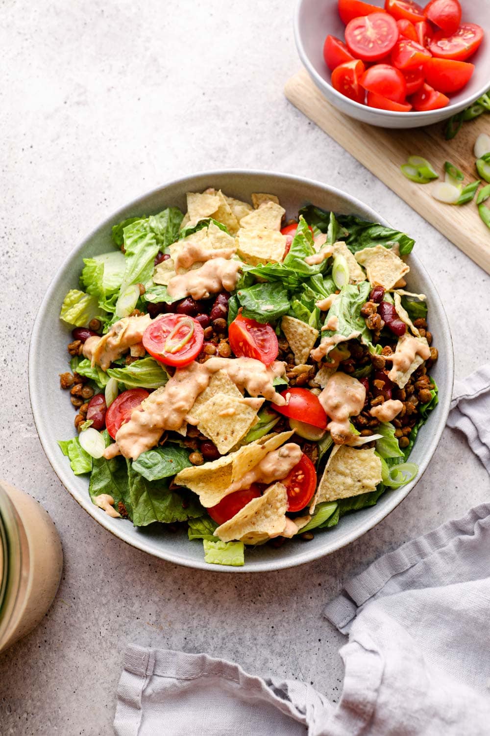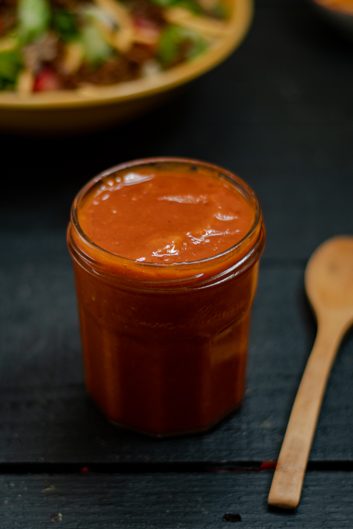 It's typically tomato-based and slightly spiced, making it a popular option for garden salads, taco salads, and more.