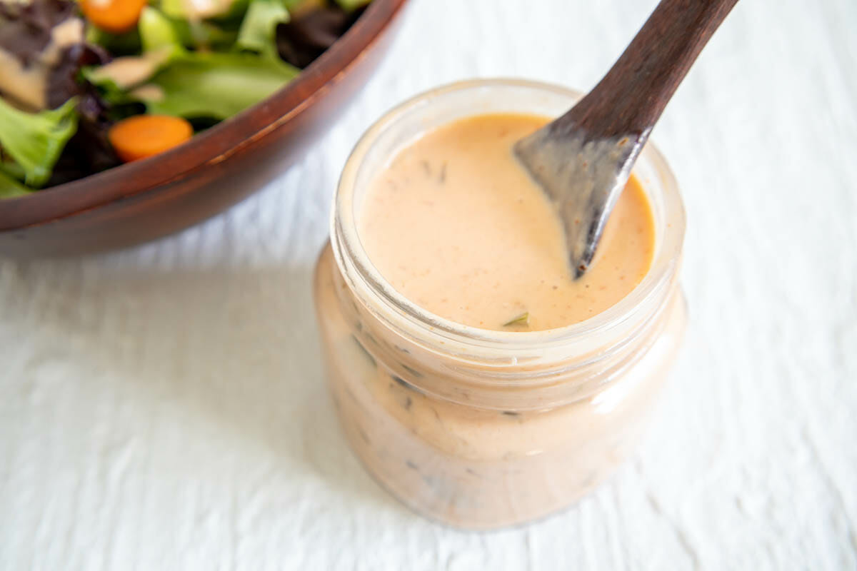 Catalina dressing is a sweet, tangy, and vibrant red salad dressing known for its bold flavor and smooth texture.
