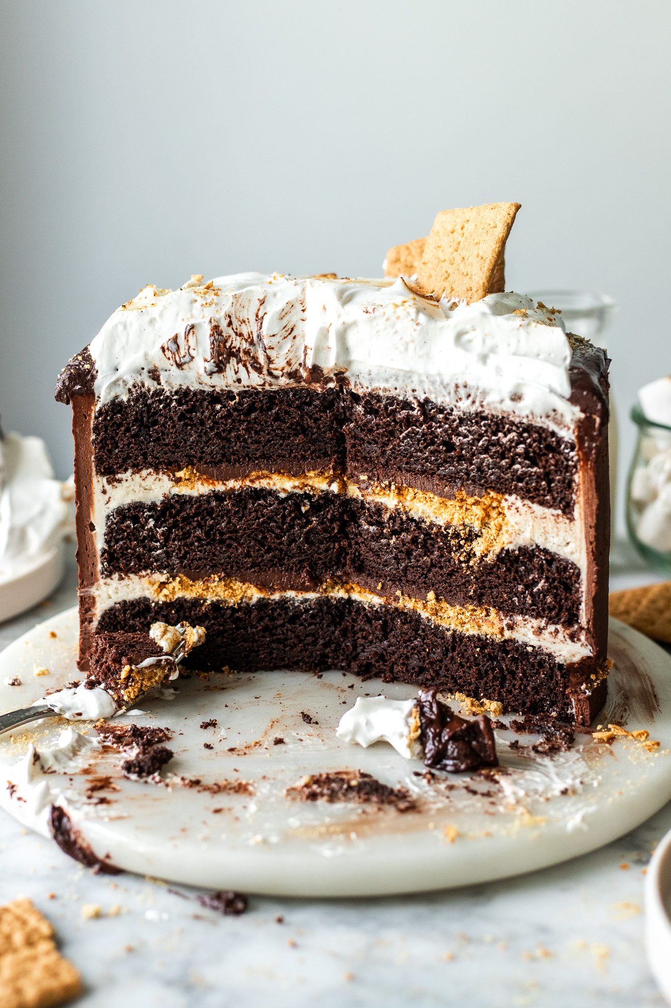 Unbelievably gooey and decadent s’mores cake with super rich molten chocolate cake, homemade graham cracker filling, decadent chocolate buttercream, and toasted eggless marshmallow fluff! You won’t even know if secretly eggless, dairy free, and easily gluten free!