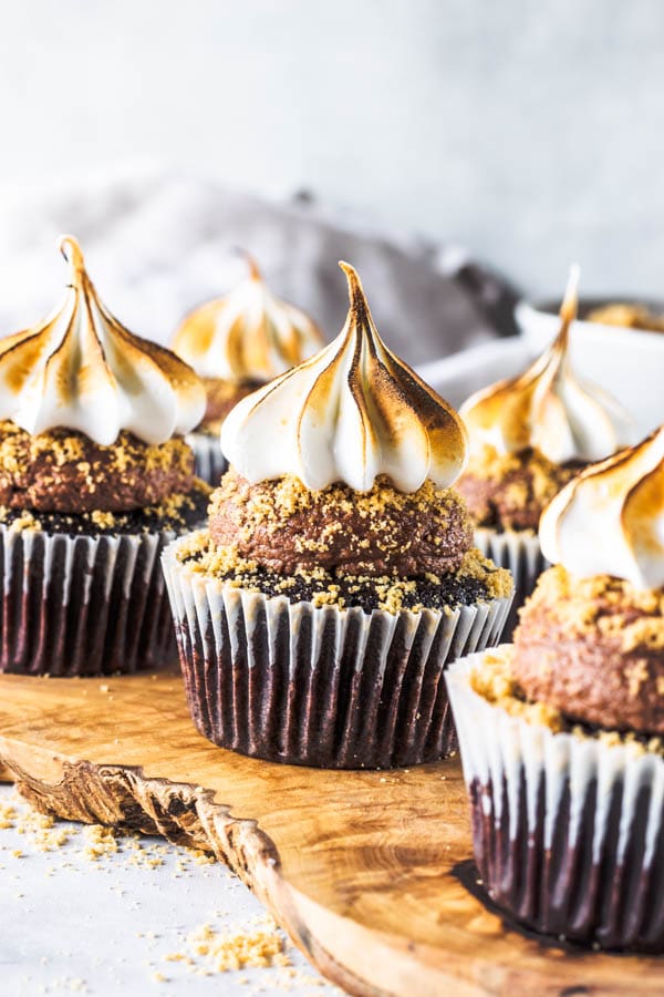 These Vegan S’mores Cupcakes are filled and topped with vegan chocolate frosting, graham cracker crumbs, and vegan marshmallow frosting.