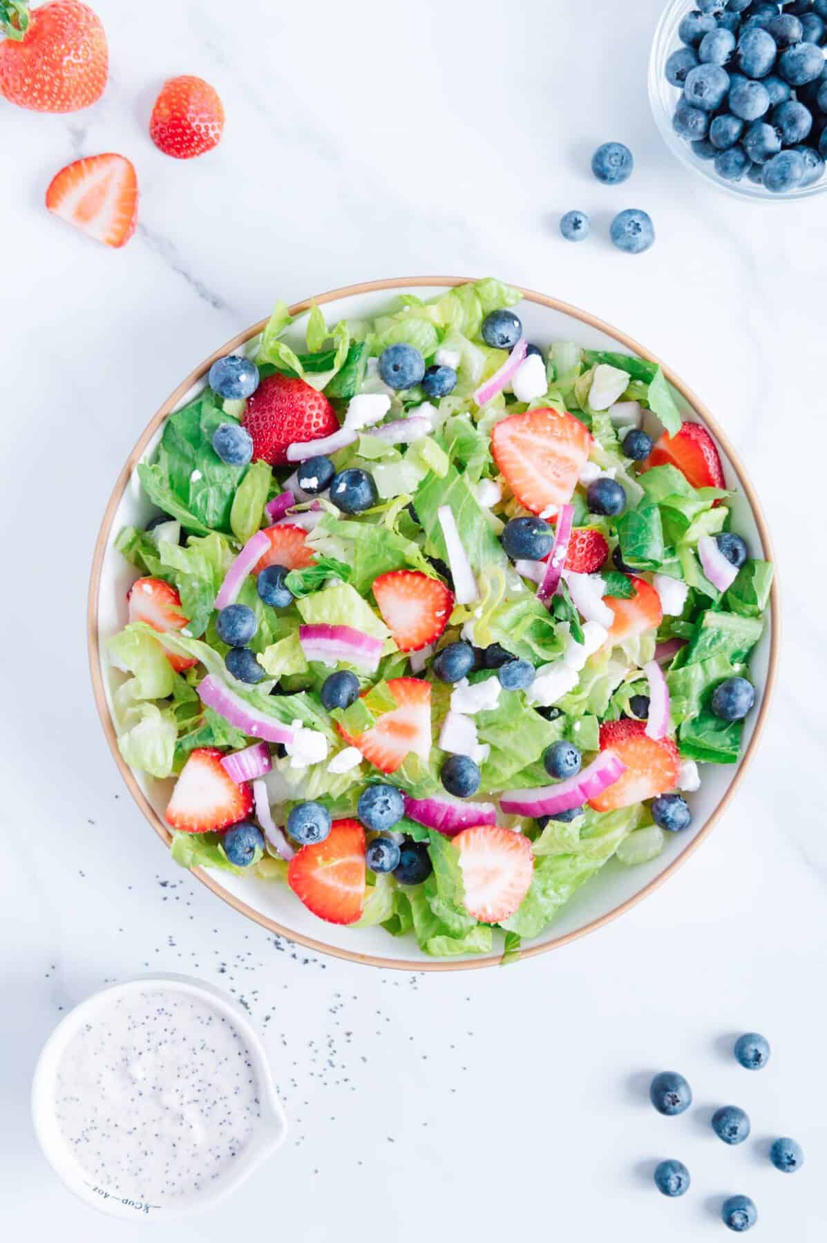 Fresh summertime produce and patriotic colors make this salad a must-have for outdoor meals in the warmer months. Chopped Romaine, fresh berries, vibrant